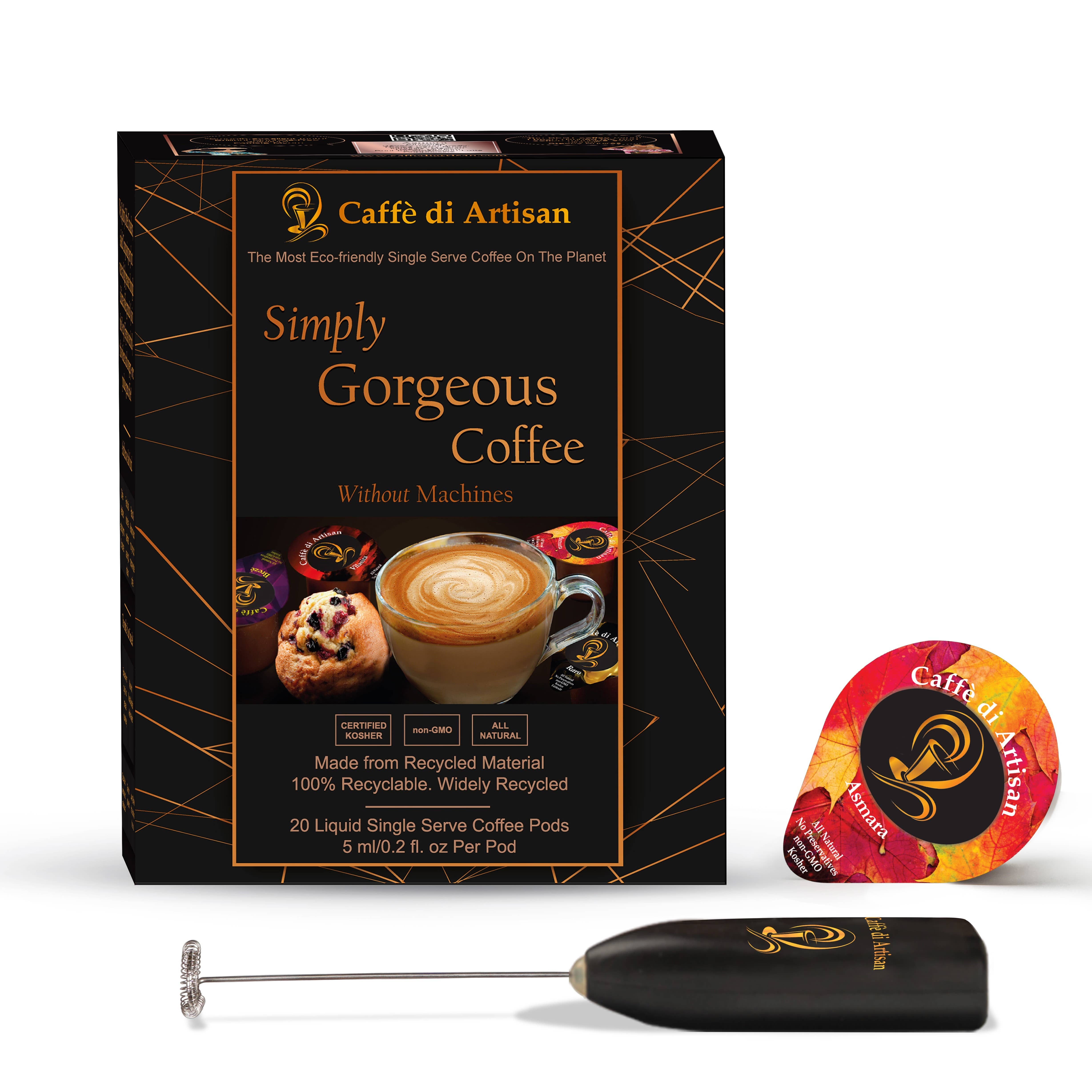 Raro: machine-free liquid coffee single-serve capsules (pack of 20 pods) Caffè di artisan brings you luxury liquid machine-free coffee pods. Gorgeous coffee that soothes the soul. Our south American single-origin luxury coffee, sourced from the Colombian highlands, is exactly what its name signifies: rare. It is the classic Colombian profile, bringing together a mellow, easy acidity and a strong caramel sweetness, with a nutty undertone. Get free shipping and free frother on every order. Made from alkaline, micro-clustered water and loaded with vitamins, for all-day energy. Our artisanal coffee will never give you acidity and mitigate the risk of health hazards associated with coffee machines (germs, rancid oils, chemicals from coffee pods).