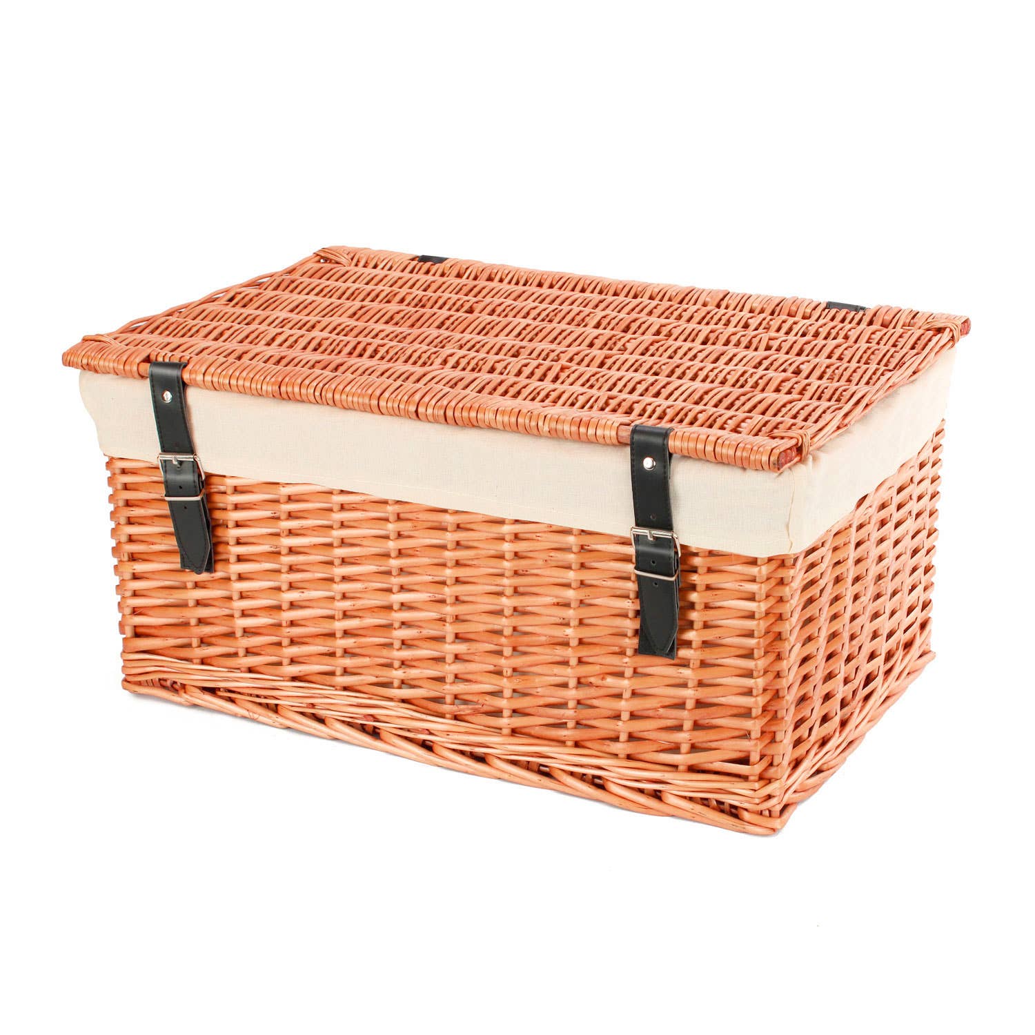 Our 18 Inch Split Willow Hamper, complete with a cotton liner, is a delightful twist on a timeless classic. These hamper baskets make perfect gifts that add value. Plus, they tick the boxes for eco-friendliness and reuse. A 18-inch size is ideal for medium-sized gifts, with two wine bottles and 5-8 moderate-sized items easily fitting inside. Our split willow hampers boast a full willow lid and a split willow base handwoven from half-round willow strands. The hamper liners are made from 140g/sqm cotton, custom-designed to fit our split willow hampers with extended straps. The removable liner secures around the hinges with hook and loop fasteners. This adds to the overall convenience and elegance. Split willow hamper baskets are a perfect choice when looking to make responsible packaging choices. We're committed to using sustainable, environmentally friendly raw materials in our products and throughout our supply chain. Our hampers are all equipped with vegan straps. As each one is handmade by our skilled weavers you'll find they're all unique, so please allow a 5% tolerance on sizes.