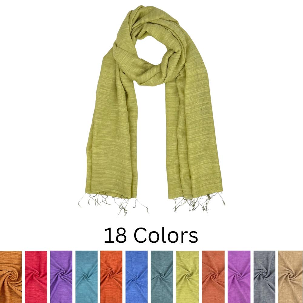 These scarves are woven using vibrant threads and subtle metallic thread accents. The result is a lightweight scarf with a breezy, sheer scarf texture that’s both elegant and versatile. Trimmed with delicate fringe, this scarf with fringe offers effortless style with a touch of boho charm. Designed to be worn year-round, it works perfectly as a summer scarf and is ideal for warm days or layered evenings. Whether you're styling it as a thin scarf, fringe scarf, or wrap, it’s a flattering piece that enhances any outfit. Popular among those seeking a scarf you will love, it’s a go-to summer scarf for ladies or a thoughtful gift for anyone looking for a stylish ladies year round scarf. With every product sold, Humble Hilo supports The Humble Village Project, a charity organization that improves the lives of the poorest Mayan people in Guatemala. Material: 85% rayon / 15% synthetic fibers Size: 17" x 70" Care: Hand wash and line dry