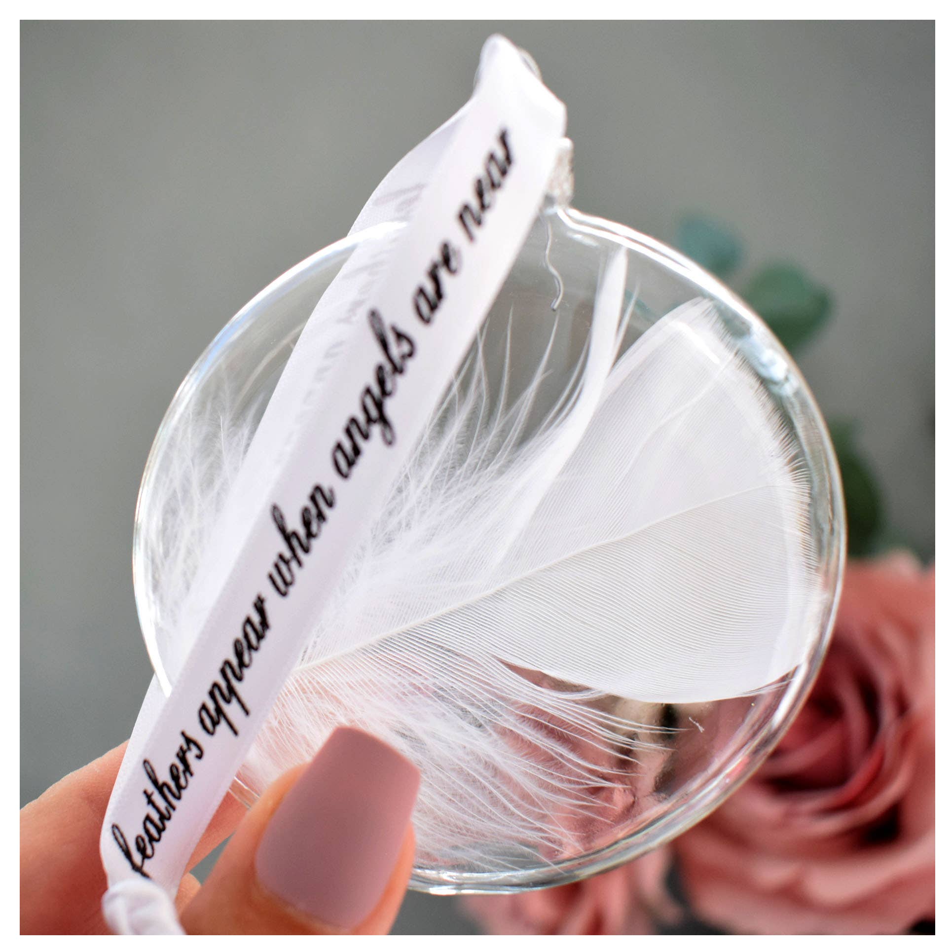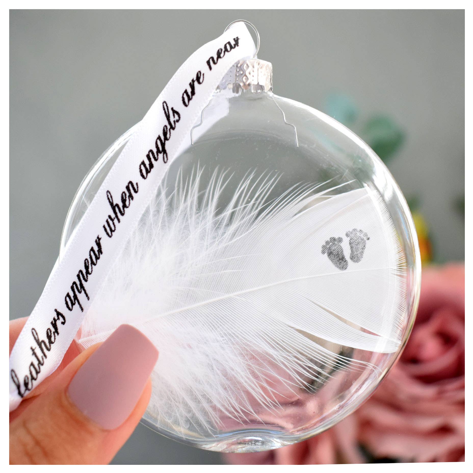 This bauble features a white feather that has the wording 'REST IN PEACE' on the feather with a heart print below. This is directly onto the feather making it so unique and special. Perfect for remembering your loved ones. These baubles are a stunningly elegant design, they are purposely designed to be a sophisticated colour palette so as to match any decor. They are presented in a simple white organza gift bag. Each feather is placed inside an 8cm(L)x 8cm(W) x 2cm(D) (not a globe shape, it is flatter) Round Shaped, glass bauble which is threaded with a printed ribbon reading "feathers appear when angels are near" measuring approx 13cm's. Please note - Handstamping is where each letter is stamped onto your feather individually and by hand, giving the result of not being perfectly uniform in finish. These are stunning christmas Decorations for the tree and for all year around. The make fab xmas seasonal decor as well as being a perfect memorial sympathy gift.