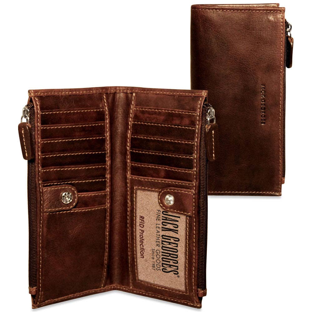 FREE MONOGRAMMING! HAND-STAINED BUFFALO LEATHER Organize your cash, cards, and photo ID in this classic bill fold with flap and RFID protection. Made from hand-stained buffalo leather that builds a rich patina as it ages. The Voyager Bifold wallet features rounded corners to resist breakage, 11 card slots, double currency pockets, slip pockets for important papers and receipts, and a window for your driver's license, school, or work ID. Classic styling combined with resilient leather ensure that this handmade wallet will look better the longer that you carry it. This wallet features: * RFID protection * Slots for 11 credit cards * An ID window * A double pocket to hold currency * Slip pockets to hold receipts, notes, etc. * Rounded corners to resist breakage * Handmade construction