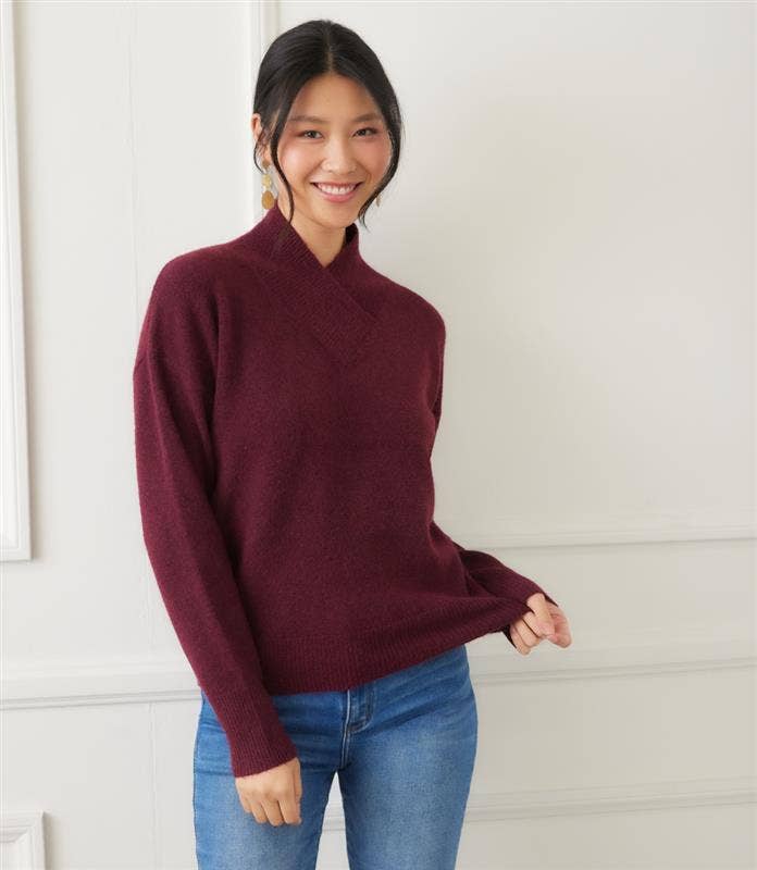 This long-sleeve sweater features a classic shawl collar for added warmth and style. Crafted from a soft knit blend with minimal wool, it offers lightweight comfort ideal for casual days or elevated lounging. Designed with relaxed drop shoulders for an effortlessly easy fit, this pull-on style is finished with wide, ribbed trim at the cuffs and hem for a clean, structured look. * Sits at the hip with a relaxed fit through the body. * Sweater: 56% Recycled Polyester 37% Polyester 5% Wool 2% Spandex * Imported * Hand wash cold, lay flat to dry or dry clean. * Length: 22 1/2 inches (Size M) * Pull on * Crossover V-Neck * Drop shoulder sleeves * Light Wool blend
