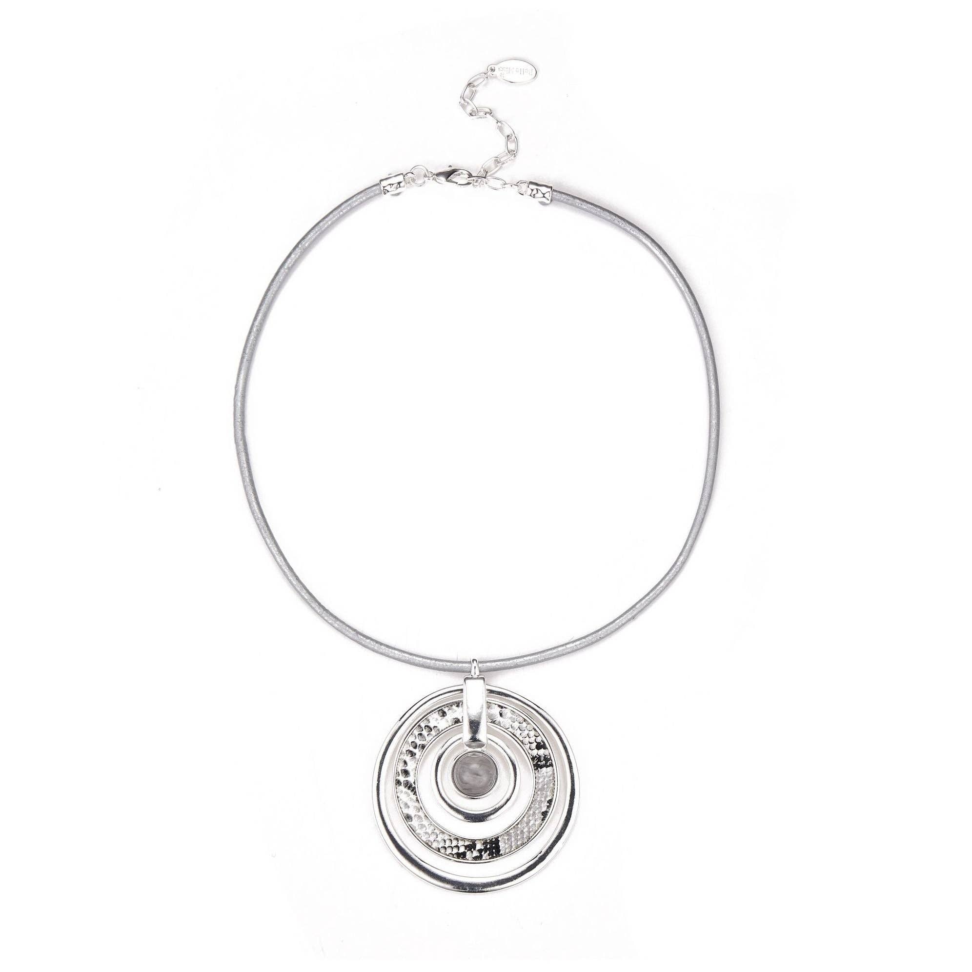 * Brushed metal pattern leather cord necklace with sequins * Length 42cm + 6cm of extension chain * Weight 21g * If you want to add extra length to the necklace, you can order an extension chain by clicking here. * You can buy gift boxes and/or bags in the accessories tab by clicking here. A CAREFUL AND REFINED DESIGN A UNIQUE BLEND OF MATERIALS AN IDEAL GIFT: If you are looking for a gift idea for women, do not hesitate any longer! With its pouch or box provided, this fantasy necklace is ideal for giving an original gift on the occasion of Mother's Day, Christmas or simply to please a loved one.