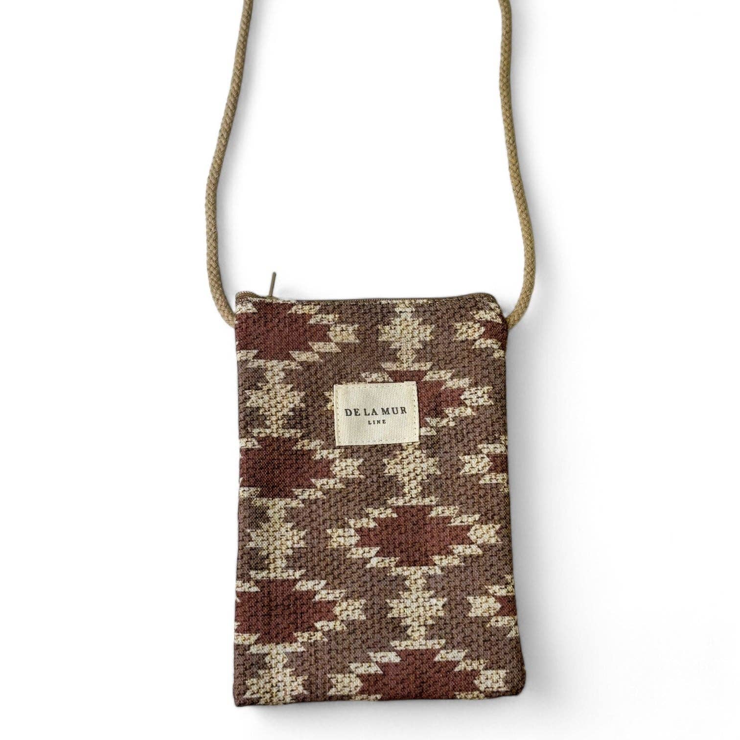 Mobile phone pouch to wear crossbody style, with a zipper at the top and a long beige cotton cord. Made of fine fabric with a geometric print in beige and rust tones. Each item may have a variation in the print, depending on where the piece was cut. Lined with thick gray fabric on the inside. For proper maintenance, it is recommended to wash it by hand in cold water and not to use a dryer. Perfect for those who lose their phone daily, so we won't lose sight of it. It has capacity for the phone and little else. Width x Height 12 x 18 cm Made with national fabrics.