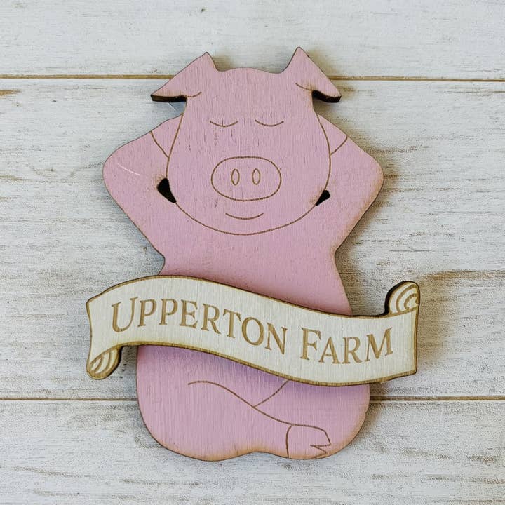 Engraved on to pink painted wood, a lovely keepsake pig decoration with personalised location engraved onto wood. -9 x 8.5cm -Engraved on to pink painted plywood with white scroll