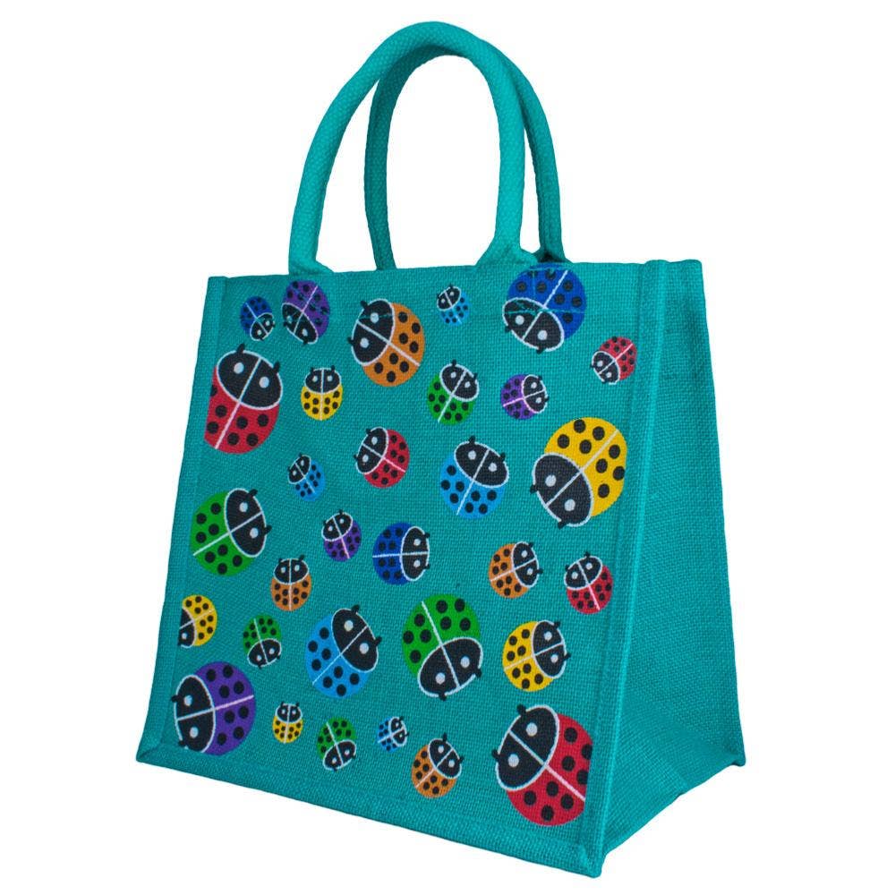 A beautiful screen-printed eco shopper, with a green background and all things associated to the garden. Same design front and back Jute is the second most important vegetable fibre after cotton and is a light, soft, shiny plant fibre that can be spun into coarse, strong threads. Jute is 100% bio-degradable and recyclable and thus environmentally friendly. Approximate measurements Dimensions: 30 (L) x 30 (H) x 20cms (W) Handle length: 36cm Made in Kolkata, India