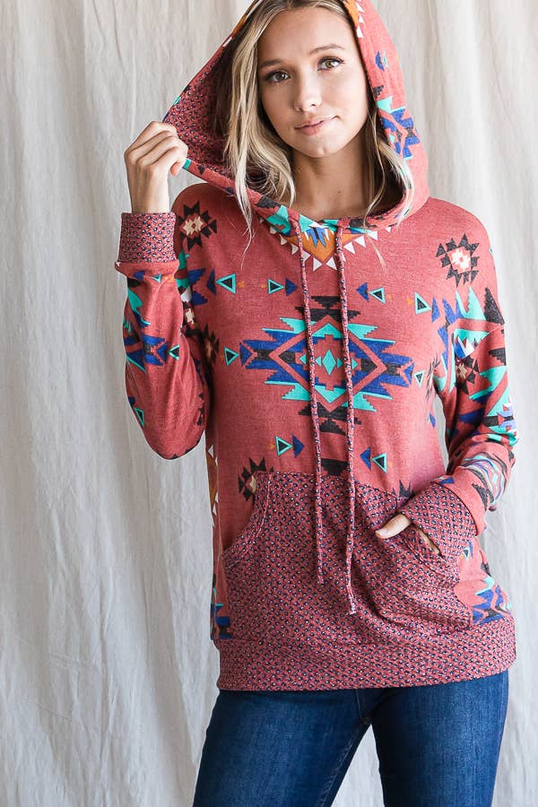 A KNIT SWEATSHIRT FEATURING A AZTEC PRINT, DRAWSTRING HOODIE, CONTRAST FRONT POCKET, AND LONG SLEEVES. *MODEL IS WEARING SIZE SMALL