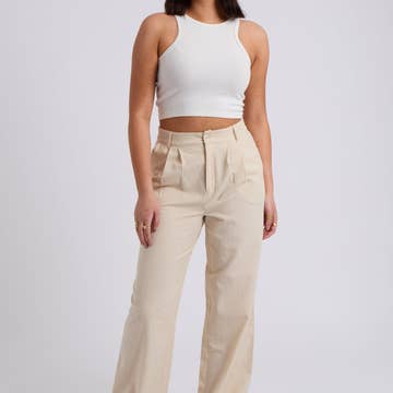 Studio Strut and Bolt Collection. Wide leg pants in stretch suiting fabric. These trousers feature wide leg, front pleat detail, belt hoops, elasticated waist at back, welt back pockets, and hook and eye with zipper closure. It can be made into a set with top SSB-T-50529-JK