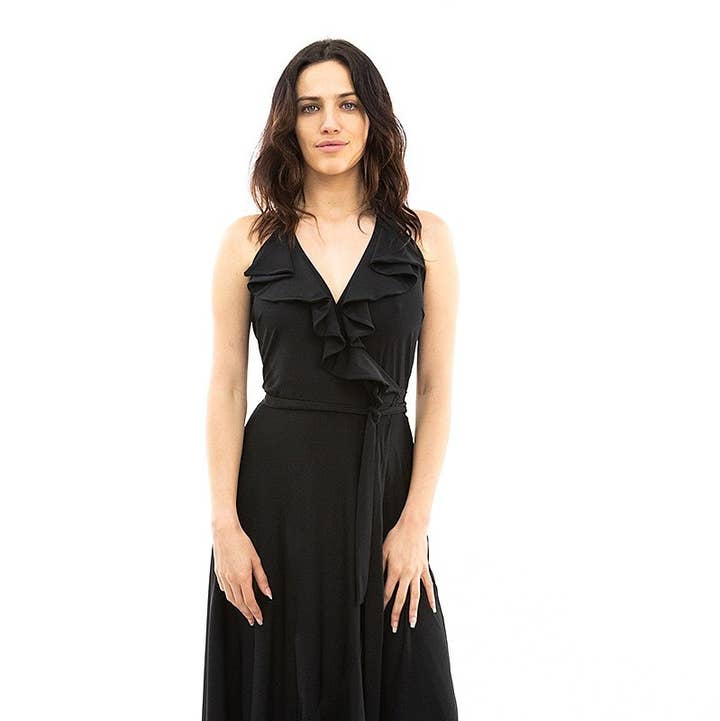 This brand new fitted mini dress named after singer-songwriter, political activist and philanthropist Annie Lenox is fresh and hot off the presses. Made out of the same slinky fabric as the Veronica Lake, this fun style comes with a flutter ruffle that extends from the front of the waist along the back to create a slenderizing angle on a super cool look. The elbow length sleeves further accentuate the ruffles to create a slimming appearance. The green fabric has a slight “crinkle” look to it.