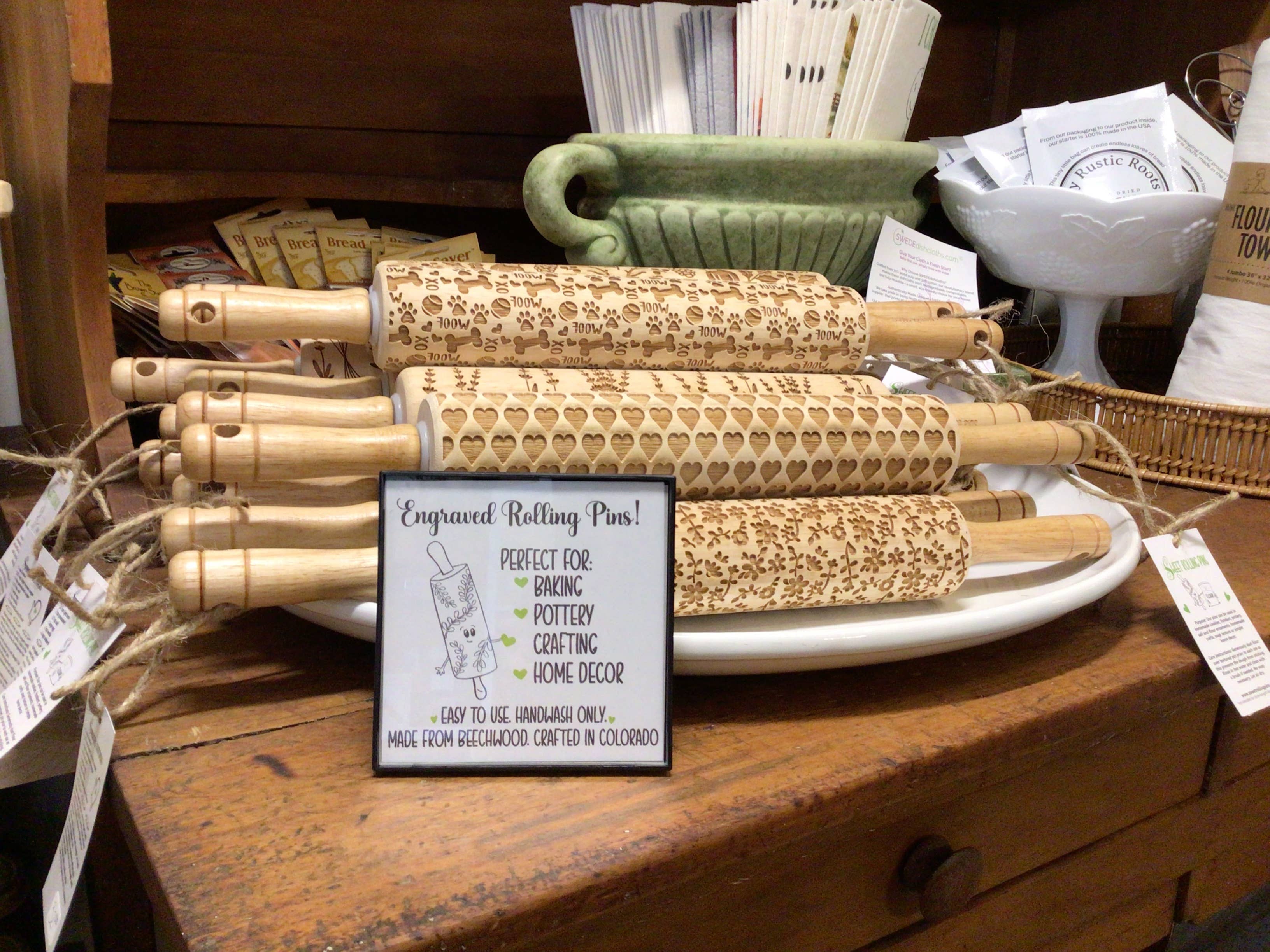 Nurture a lifetime of memories while baking cookies and sharing life and faith together in the kitchen! The Muddy Fork Pottery Studio (in Cincinnati) and Sweet Rolling Pins are delighted to present a "Journey to Bethlehem" engraved rolling pins paired with wondering questions and play-filled activity to further engage each story. Baking and being in the kitchen is a time to treasure. From making a mess with a young kiddo, baking quietly trying a new recipe or just enjoying the delightful smells that bring you back to childhood, our rolling pins are a fun tool for your kitchen and great conversation piece. This adorable set of rolling pins is an absolute must have for you or the baker or potter in your life. Intended for homemade sugar cookies, springerle cookies, peanut butter roll out cookies, gingerbread cookies, fondant, flour and salt ornaments, pottery and plenty more! Or, if you don’t bake…not to worry. Simply put it on your kitchen counter to admire every day for cozy décor. Wooden barrel measures 10" x 2". Including handles, the entire pin measures 17 x 2. Hand wash only, dry with dish towel and let air dry. Ships from Colorado, USA. Arrives with a tried and true recipe and care instructions. The Muddy Fork Pottery studio is a full service pottery studio specializing in all things faith based. IG and FB: themuddyfork --- P.S. While this adorable pin is intended for the reasons listed, it is not intended for homemade pies or cobblers. Well, kind of. Most pie bakers use Crisco and while the dough will look amazing, the images will bake out. For those of you who use a homemade shortbread based recipe, this rolling pin will work. Also, you can use the frozen roll out pie crusts as well. If you bake a pie with our pin, we’d love to see a picture! P.S.S. We recently wrote a recipe book containing various recipes that work beautifully with our rolling pins called, Just Roll With It, Recipes for easy embossed cookies. Tried and true recipes all in one place – how sweet is that?