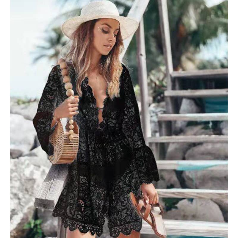 Material:Lace Style:Long Sleeve,Loose Occasion:Casual,Vacation,Bohemia,Beach Seasons:Summer Type:Cover-Ups Swimwear Size FREE SIZE (inch) : Bust= 42.12 ; Sleeve= 15.60 ; Length= 52.65 ;