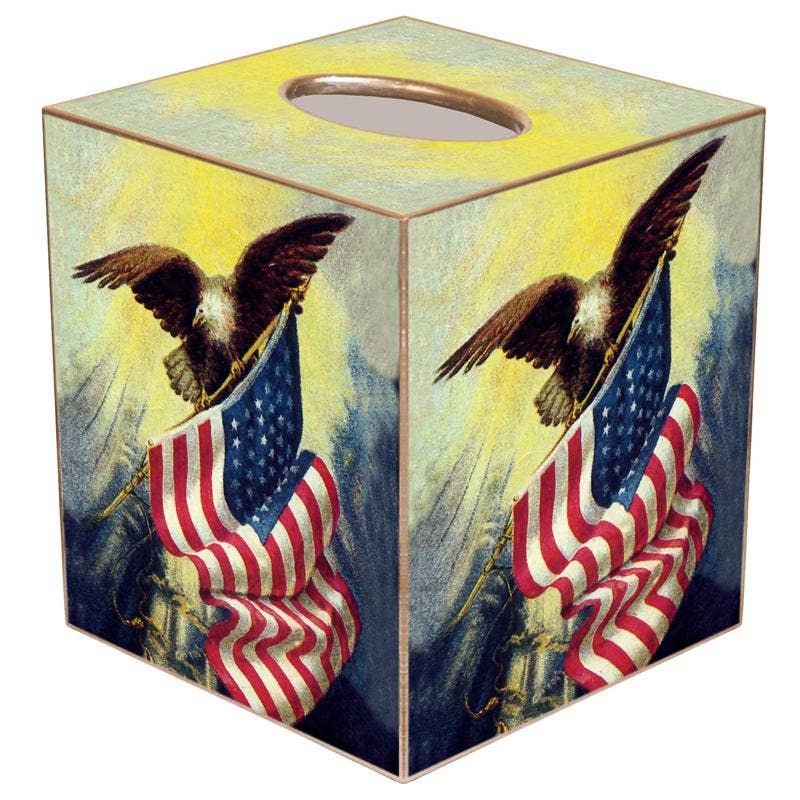 Our decoupage tissue box covers are handmade to order by our wonderful team in Houston, TX. They easily slide over any cubed tissue box cover. The artwork is hand-cut, decoupaged, and polished. Each tissue box cover is hand painted in gold or silver around the edges as the finishing touch. We offer 3 materials for the tissue box covers: 1. Papier Mache: $19 Dimensions: 5.5” H x 5” W x 5” L 2. Wood: $30 Dimensions: 5.25” H X 5” W X 5” L 3. Tin: $30 Dimensions: 5.75” H x 5.125” W x 5.125” L