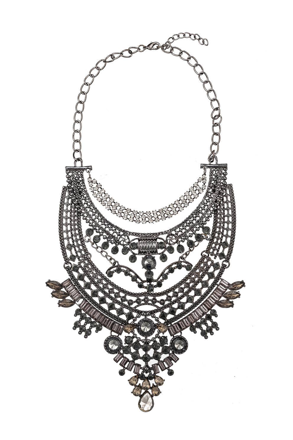 Make a statement with the Kavya collar necklace. Style up any outfit with this piece. Product Details: * Silver tone alloy chain * Glass crystal details * Clasp: lobster * Measurements: approx. 12" with 3" extension