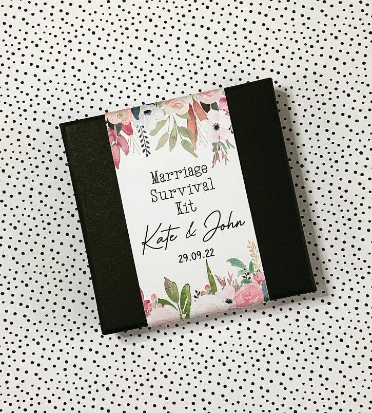 Personalised wedding hangover kit boxes personalised sleeves! These beautiful wedding favours are kraft style boxes measuring 9.5cm x 6.5cm x 2.5cm. The boxes each come with their own personalised sleeve of your choice (see all the images for the styles available). The sleeves are personalised with the Bride Grooms name and the date of your special day! A contents list is included as follows: - Hangover Kit. Beanies Coffee:  A much needed caffeine boost Mint :  Disguise last nights booze this mornings coffee Eraser:  To rub out any embarrassing flashbacks A Penny:  So that you’re not penniless Moaam Joystix:  For a joyous, well craved sugar boost Joke:  To see the funny side even if you’re not feeling it! Ear Plugs:  So everything is a little quieter Plaster:  For any injuries caused on the dance floor Love Heart :  To say we love you as a keepsake Paracetamol:  For the morning after the night before!