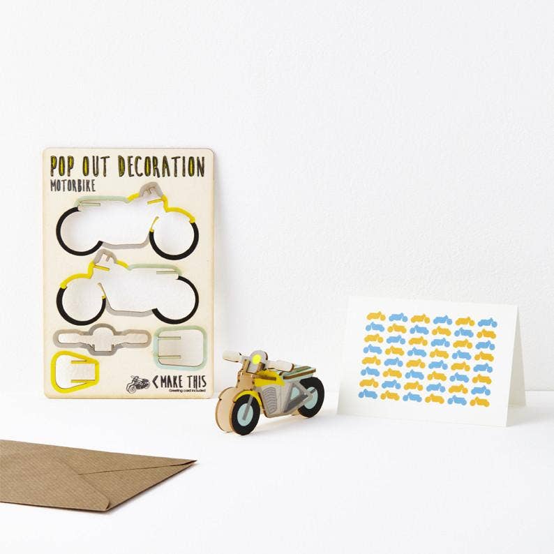 Pop out motorbike greeting card in blue, yellow, grey and black tones. Vroom vroom! ---------------------------------------------- ⭐ ABOUT OUR POP OUT CARDS ---------------------------------------------- A gift and a card rolled perfectly into one! Simply send flat to your friend or family member who will pop out the parts and slot together to create their very own pop out motorbike decoration. A delightful keepsake crafted using a 100% recyclable PEFC certified, eco-friendly material and lovingly made in the United Kingdom. Accompanied by: an A7 greeting card with repeat motorbike pattern (left blank for your own message) and a brown A6 envelope. 'Pre-popped' decoration 106 x 156 mm | Suitable for standard UK postage