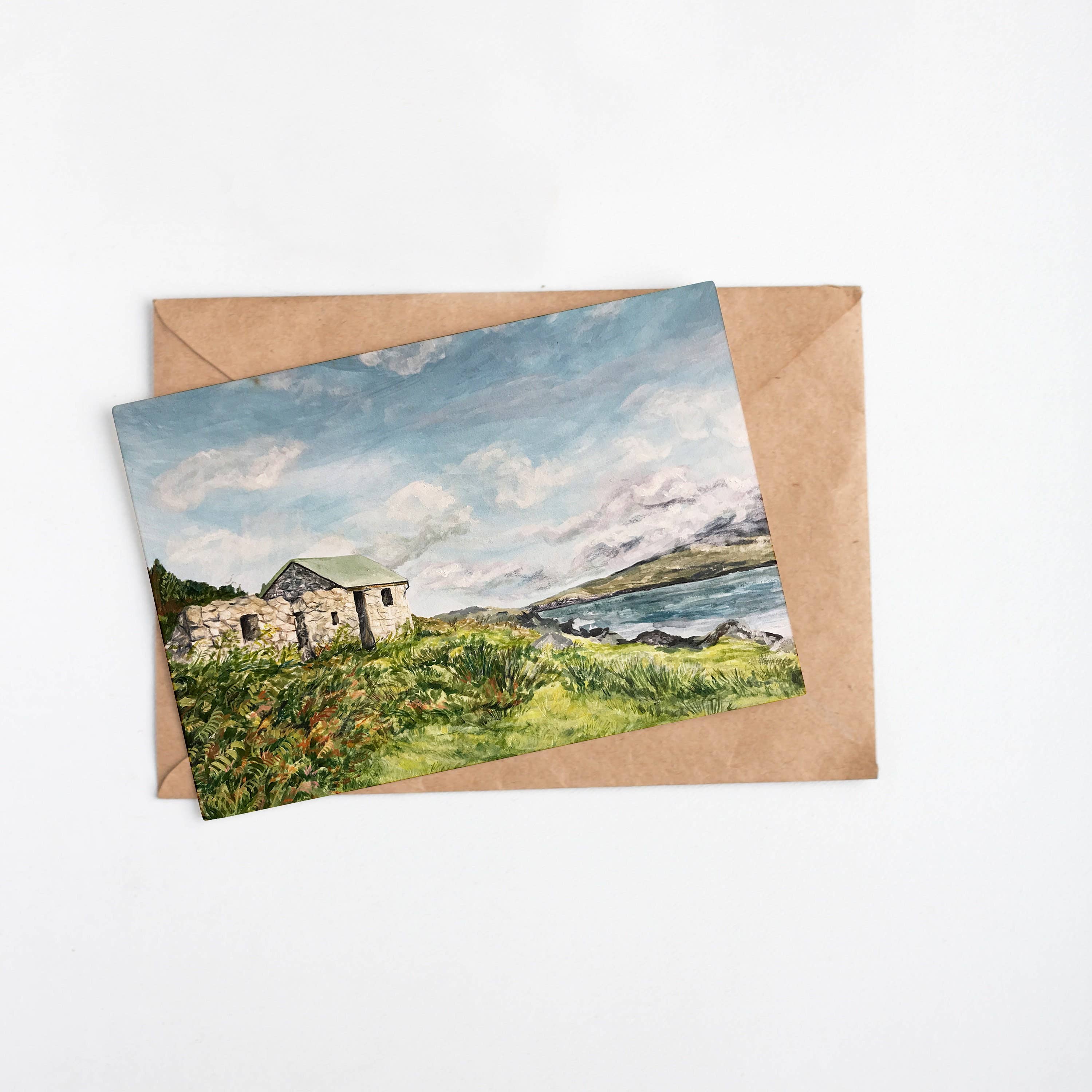 A6 Greetings Card. Hand painted Mountain Scene. Blank Inside. Brown Kraft Envelopes included. Printed on 350gsm Recycled Paper.