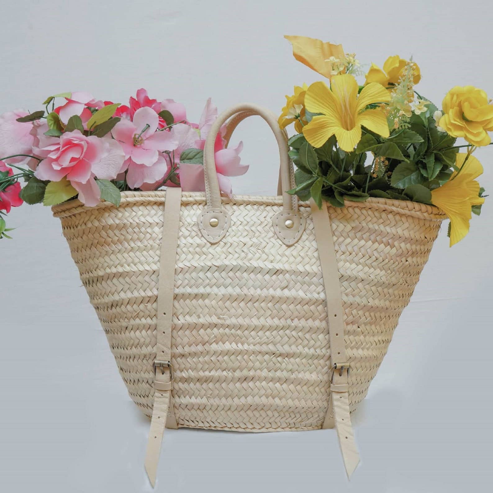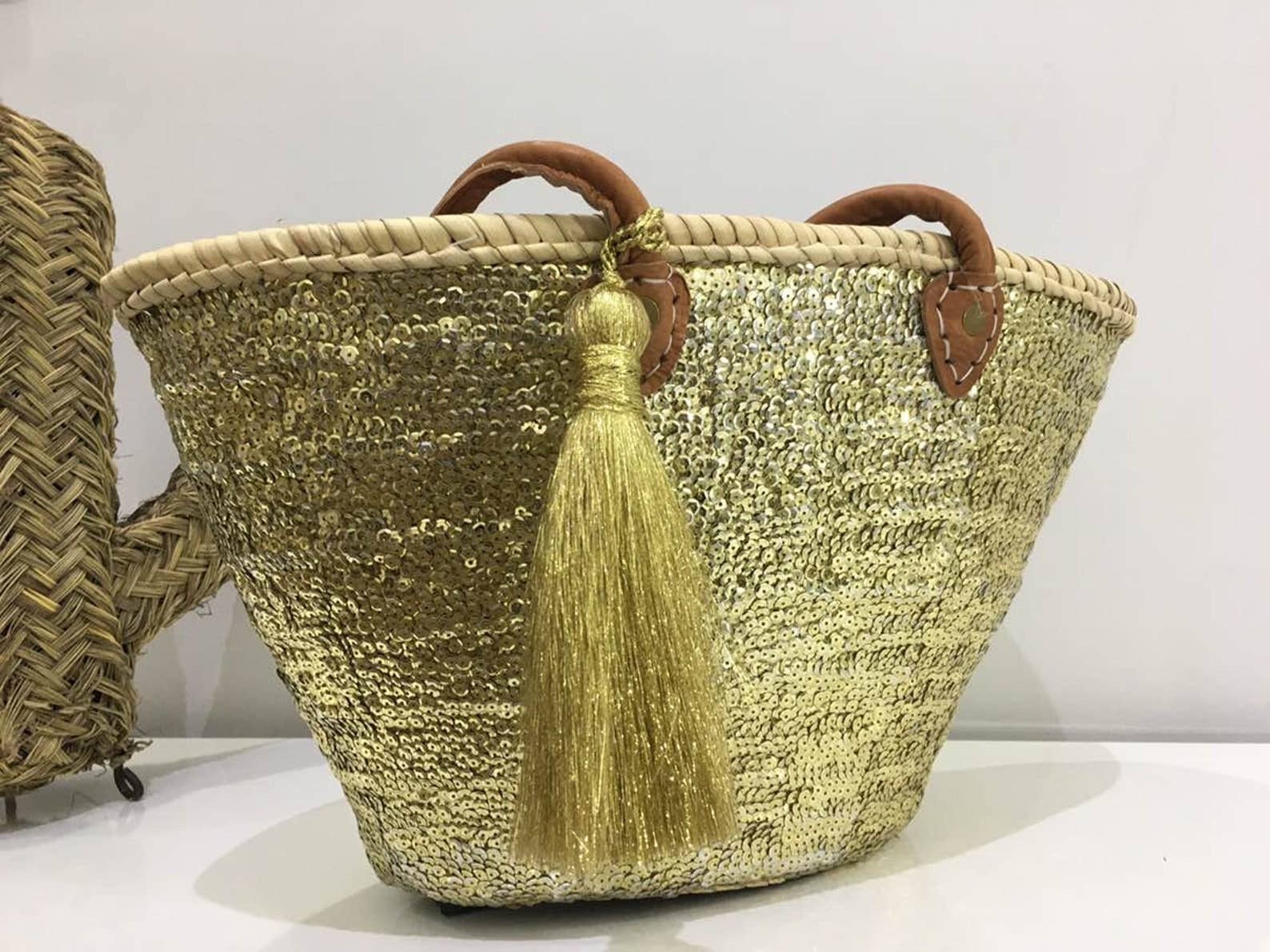 Our products are handmade by artisans using traditional techniques. Although each piece is created by an expert in their field, handmade and vintage items are perfectly imperfect. There may be slight imperfections such as fading colors, loose threads, or signs of wear. We believe that these characteristics are part of the history of the product and the craftsman who made it, making it truly unique. We hope you share this vision! From the beach to brunch, this bag is perfect for carrying your belongings while remaining very chic. Size: 20 cm in diameter, 20 cm in height, 5.7 cm in depth, the leather strap is adjustable Materials: Moroccan palm leaves, genuine leather Origin: Handwoven by artisans in Morocco Available in two options: brass clasp or chrome clasp