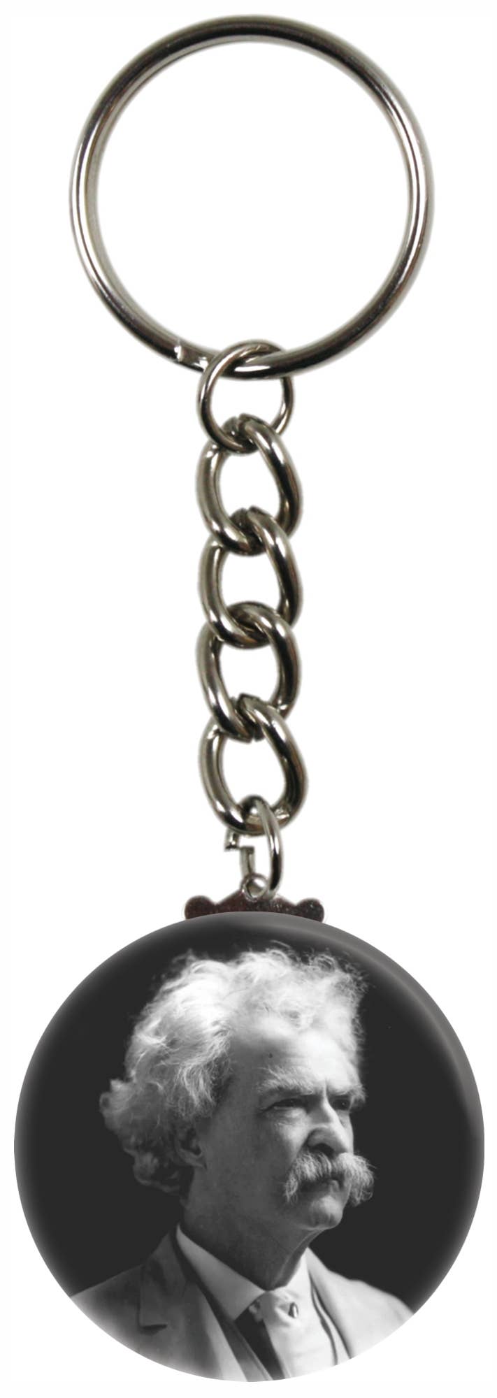 This Baseball keychain measures 1.5" round without keyring and chain. The ring measures 1-1/16" round, and chain measures 1-5/8" long. Proudly made in the USA!