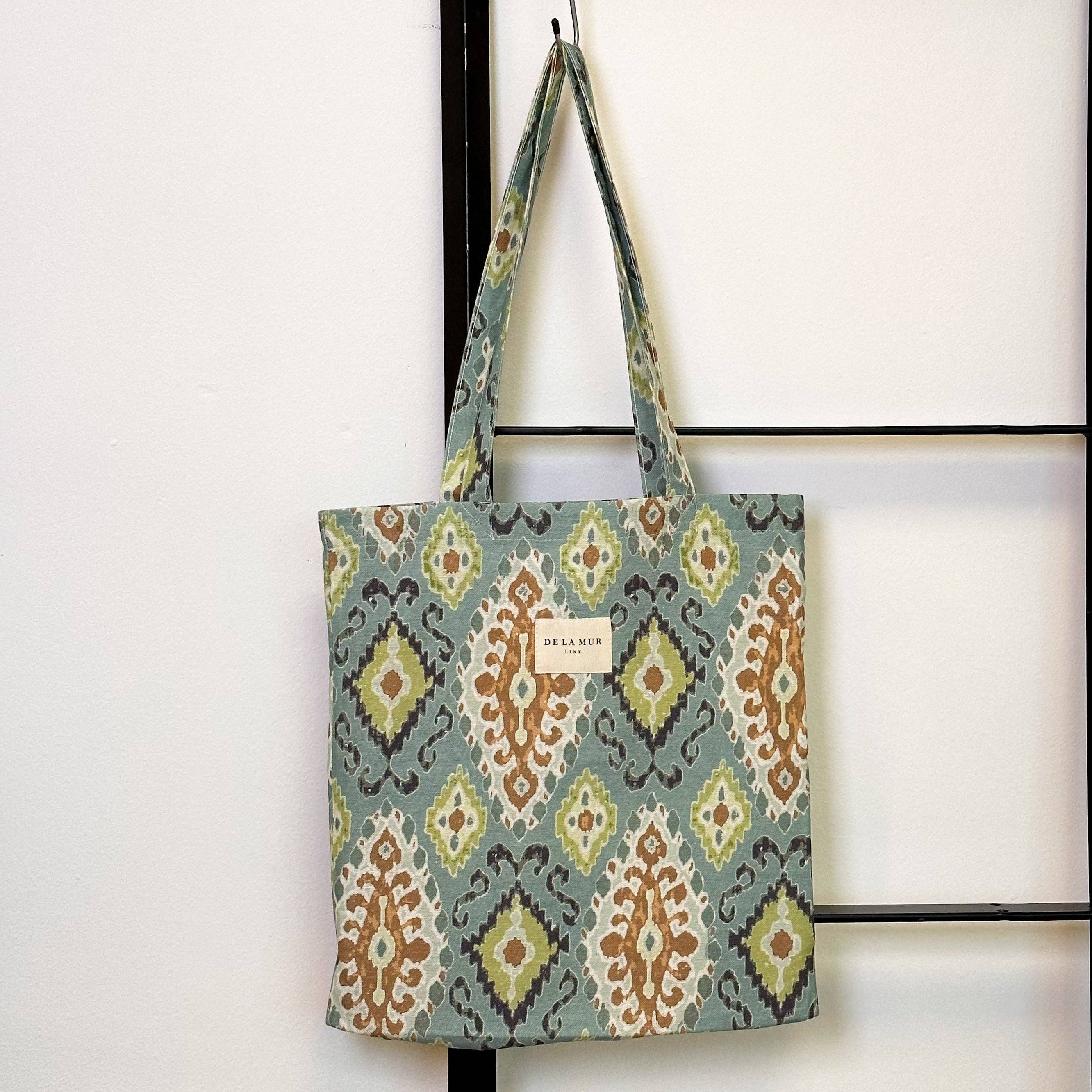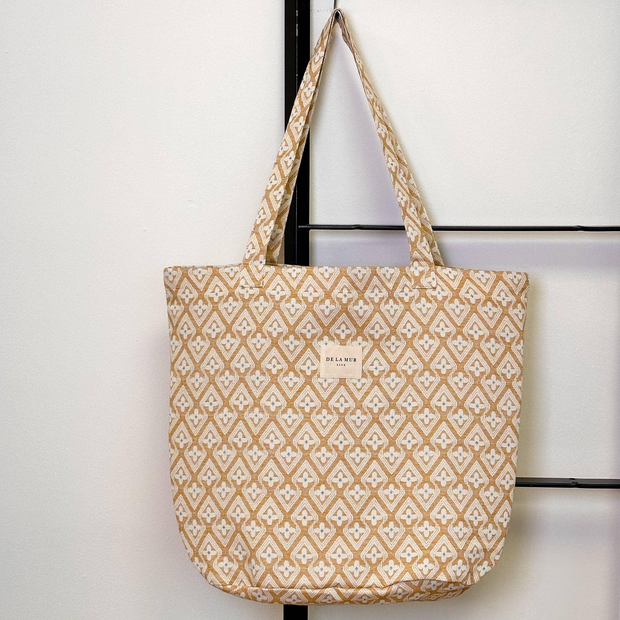 Large shopper bag with shoulder straps. Featuring a geometric print fabric in green and ochre tones. For proper maintenance, it is recommended to wash it by hand in cold water and not to use a dryer. Width x Height 50 x 39 cm Made with national fabrics.