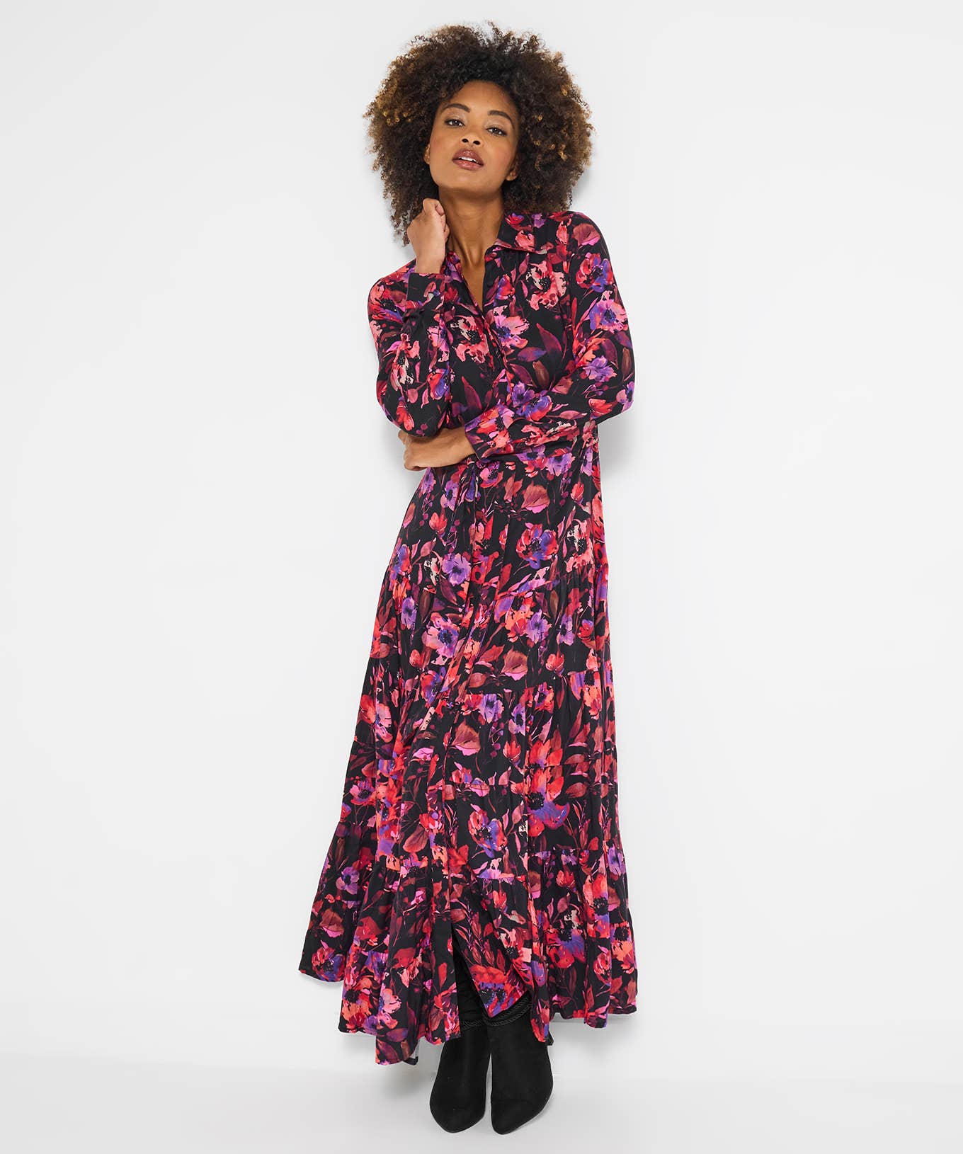 Retro inspired, new shape for aw25, easy to wear shirt dress, fabulous geo print in suble pinks and blues, midi length with panalled design, long sleves, pretty pink buttons
