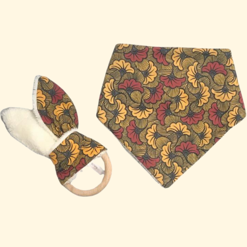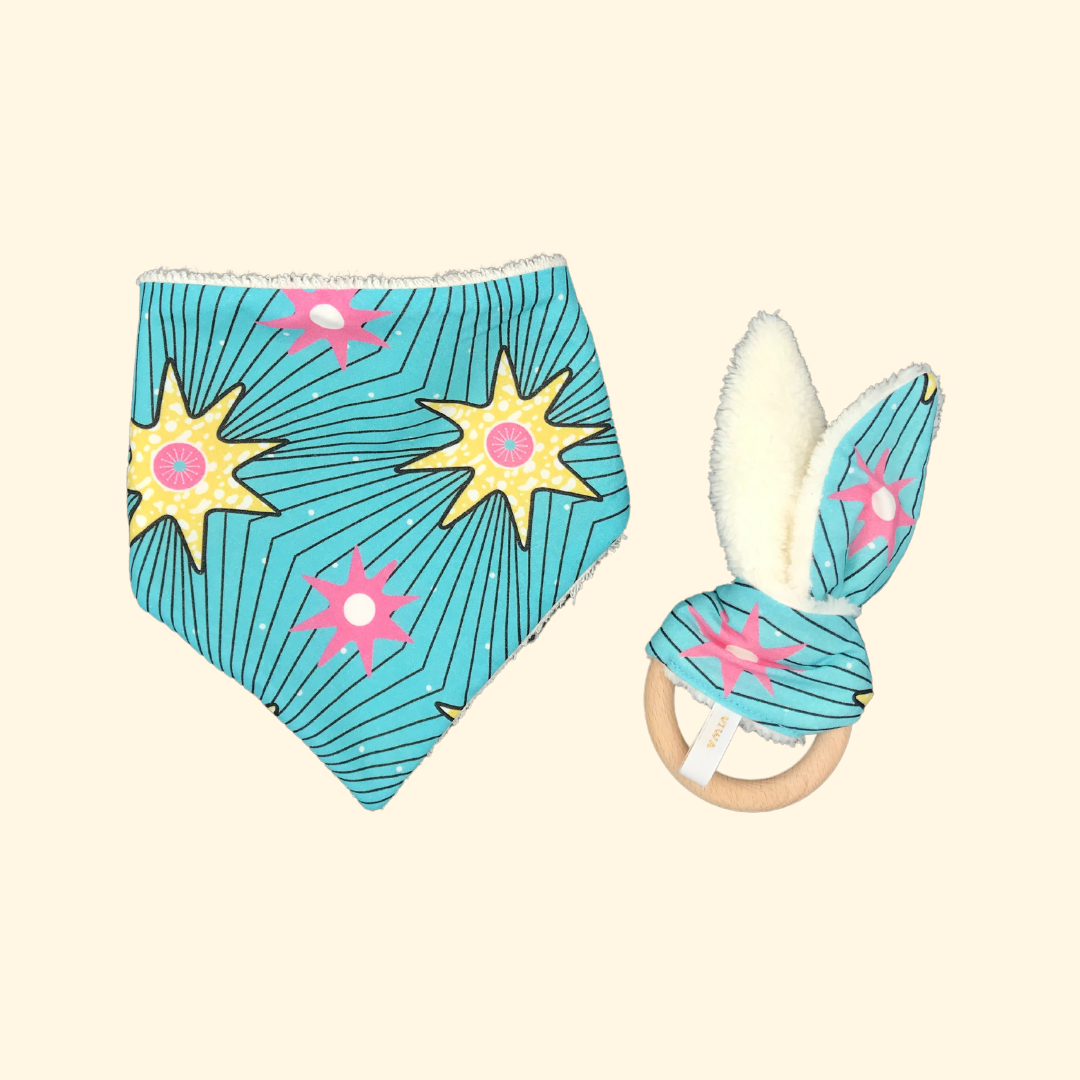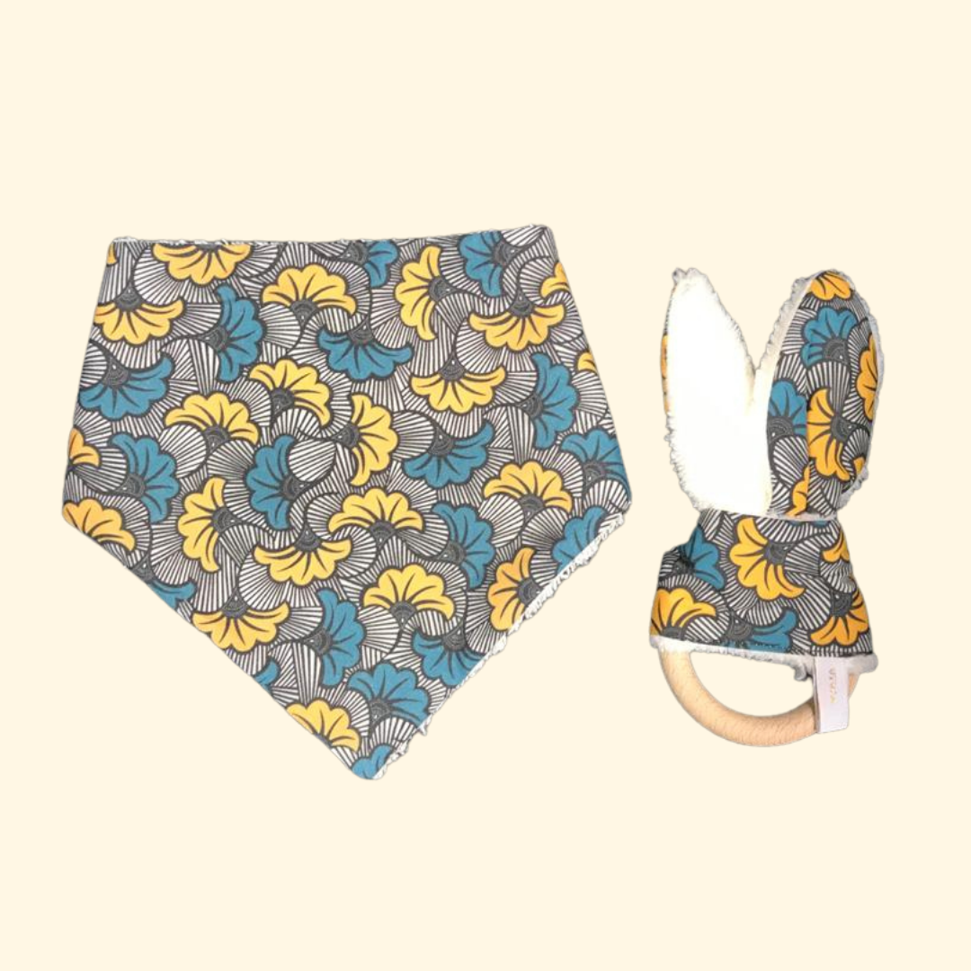 Here is a birth box: beautiful, useful and eco-solidarity! The little extra: the colored fabric is printed in France, with biodegradable inks on organic cotton woven in France. - A pretty bandana bib full of colors. Baby is teething and drooling a lot? Do you want a bib... that's functional AND pretty? This bandana bib will allow your baby to: * stay dry * to be elegant... even when he drools! The terry cloth of the bib is also made of organic cotton. The little extra: it is made in a traditional way by an insertion workshop in Lyon. - A rattle for awakening and teething. How to keep a baby occupied? How to soothe your pain during teething? This little rabbit will become an ideal companion! The colors and textures will allow him to play and stimulate his awakening.