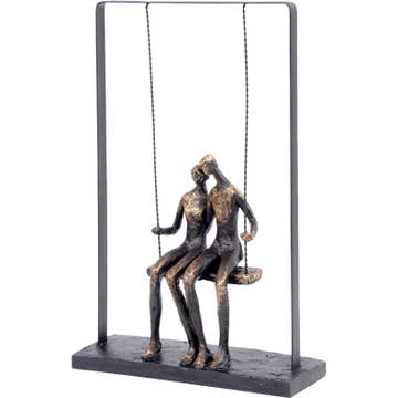 This sculpture is either 12 or 16 inches tall and welded onto a base, so it works well on a tabletop or a garden. It is made with a natural steel or tie-dye finish.