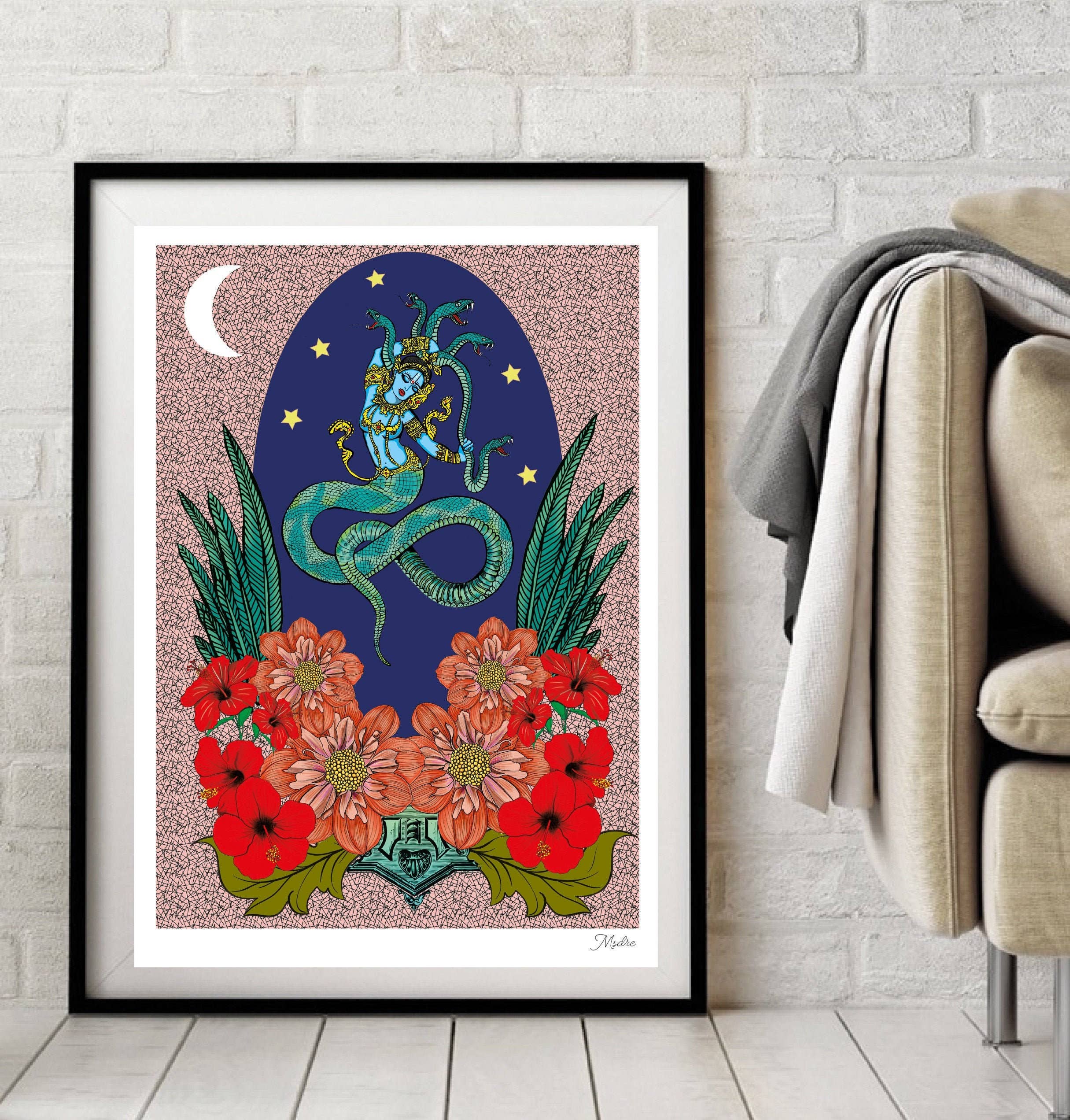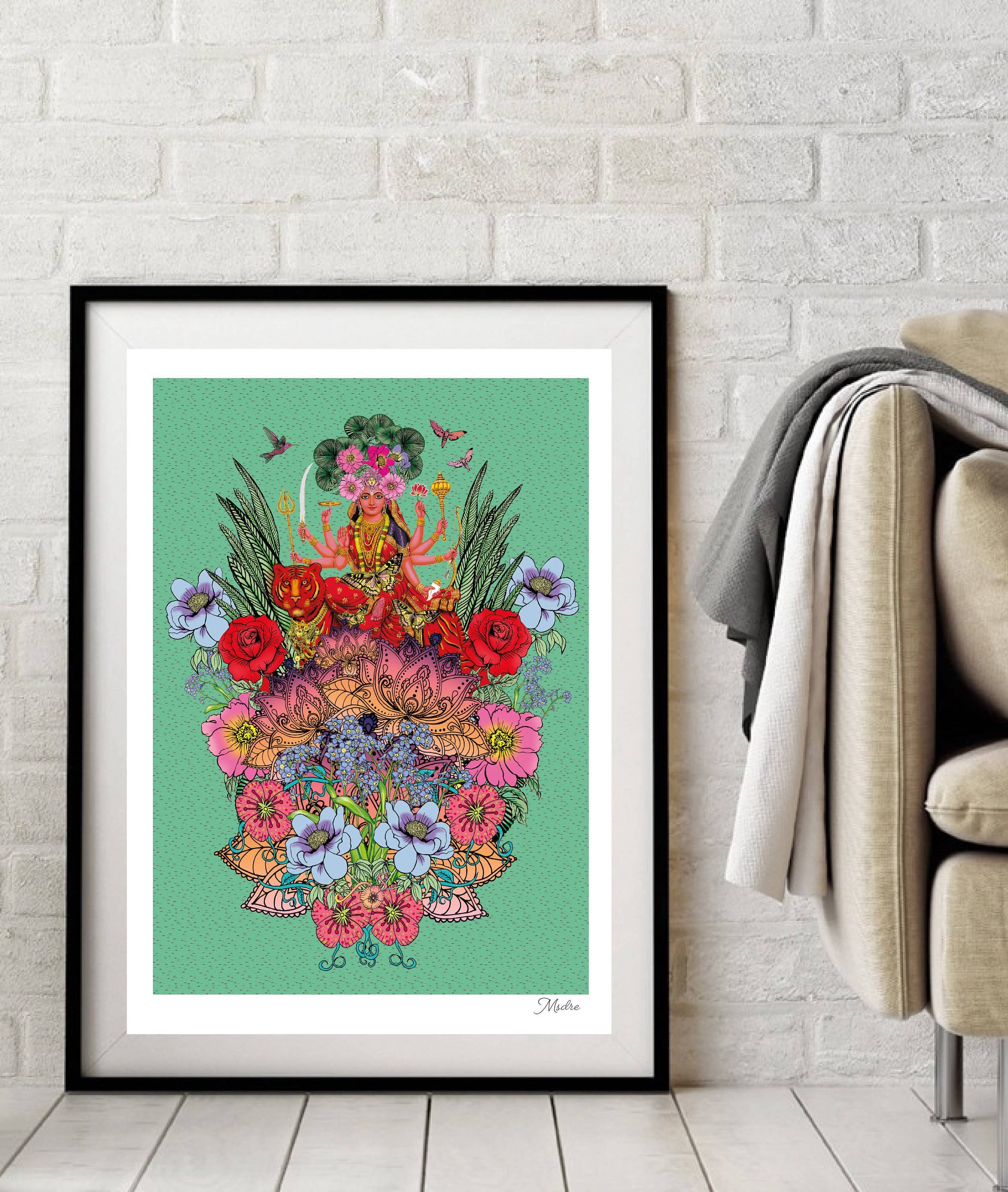 Durga Ma Indian Goddess Hindu Hinduism God Giclee' High Quality Print A4 / A3 Giclee' Prints - Fine art giclée prints are high quality inkjet prints. Hand signed by artist. Printed to order. Hand stamped logo of autherization on the back bottom corner of print. Presented in cello wrap with card board backing for easy display in your shop. Msdre... is a British artist from Brighton in the south coast of the United Kingdom Follow her on instagram @ Msdre_art Please note this piece is unframed.