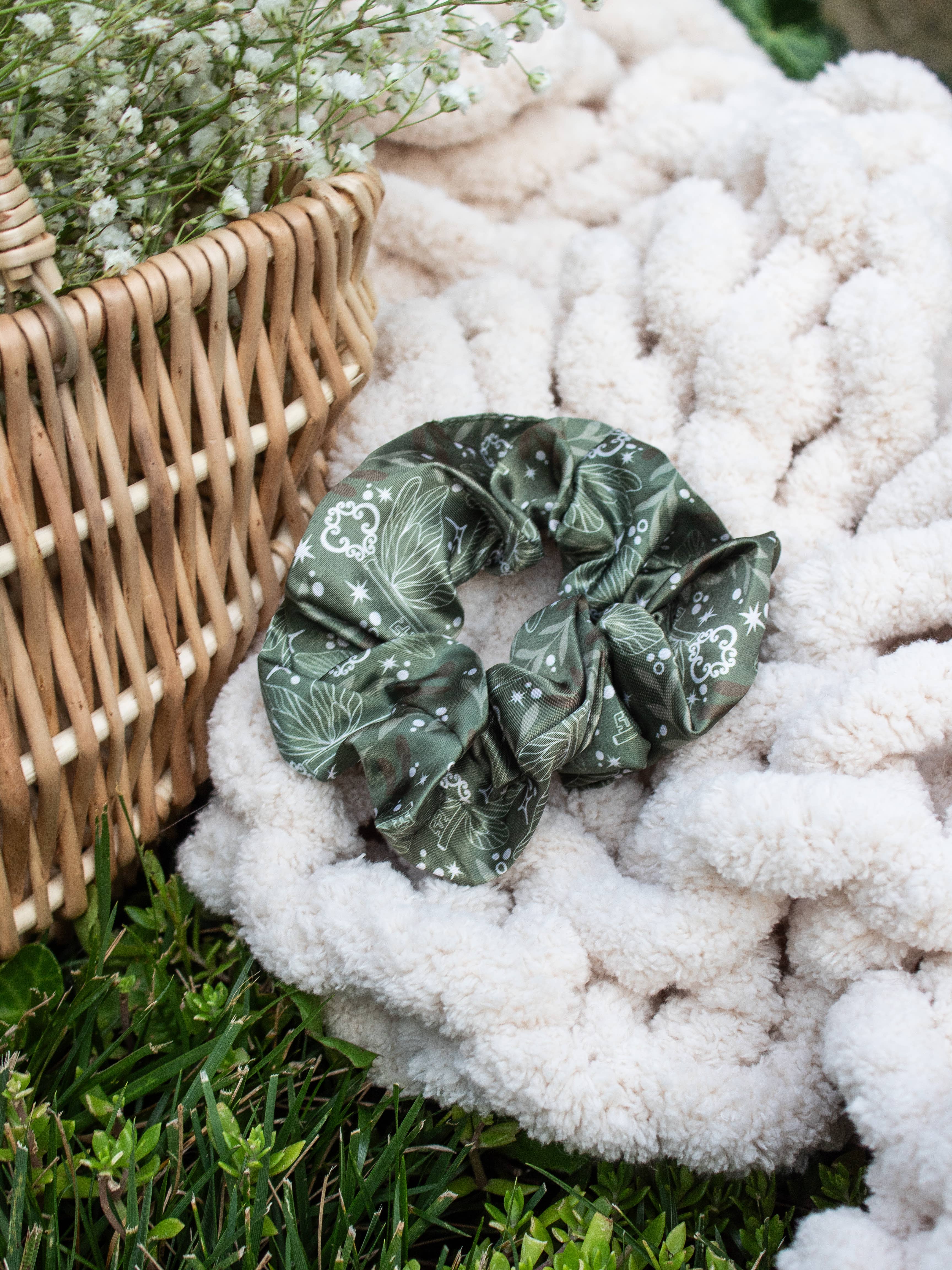 These satin scrunchies are printed with a hand drawn bookish design. Perfect for curling with with a messy bun and a good book. // Details // - Satin - 100% Polyester - Printed Design