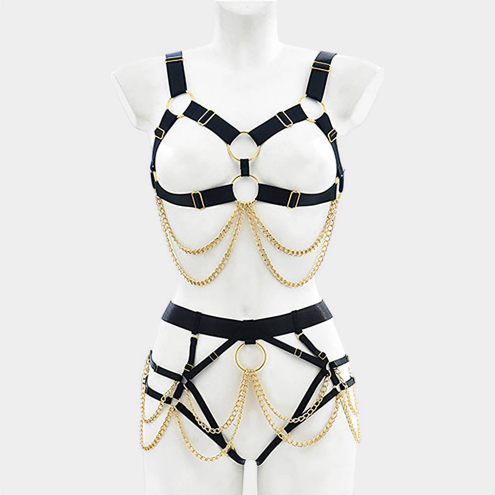Draped Chain Gothic Punk Cape Harness Costume Body Jewelry • Necklace Size : 32" + 27" L, 16" L • Waist Size : 30" + 15" L • Bottom Size : 14.25" L Transform your boutique's lingerie collection with the Seductive Black Leather Harness Lingerie Set with Gold Chains. Designed for bold and confident individuals, this set combines edgy leather straps, alluring gold chains, and metal hardware to create a stunning, high-fashion lingerie ensemble. The strategically placed chains add an element of sophisticated sensuality, while the comfortable, adjustable straps ensure a custom fit that enhances every curve.