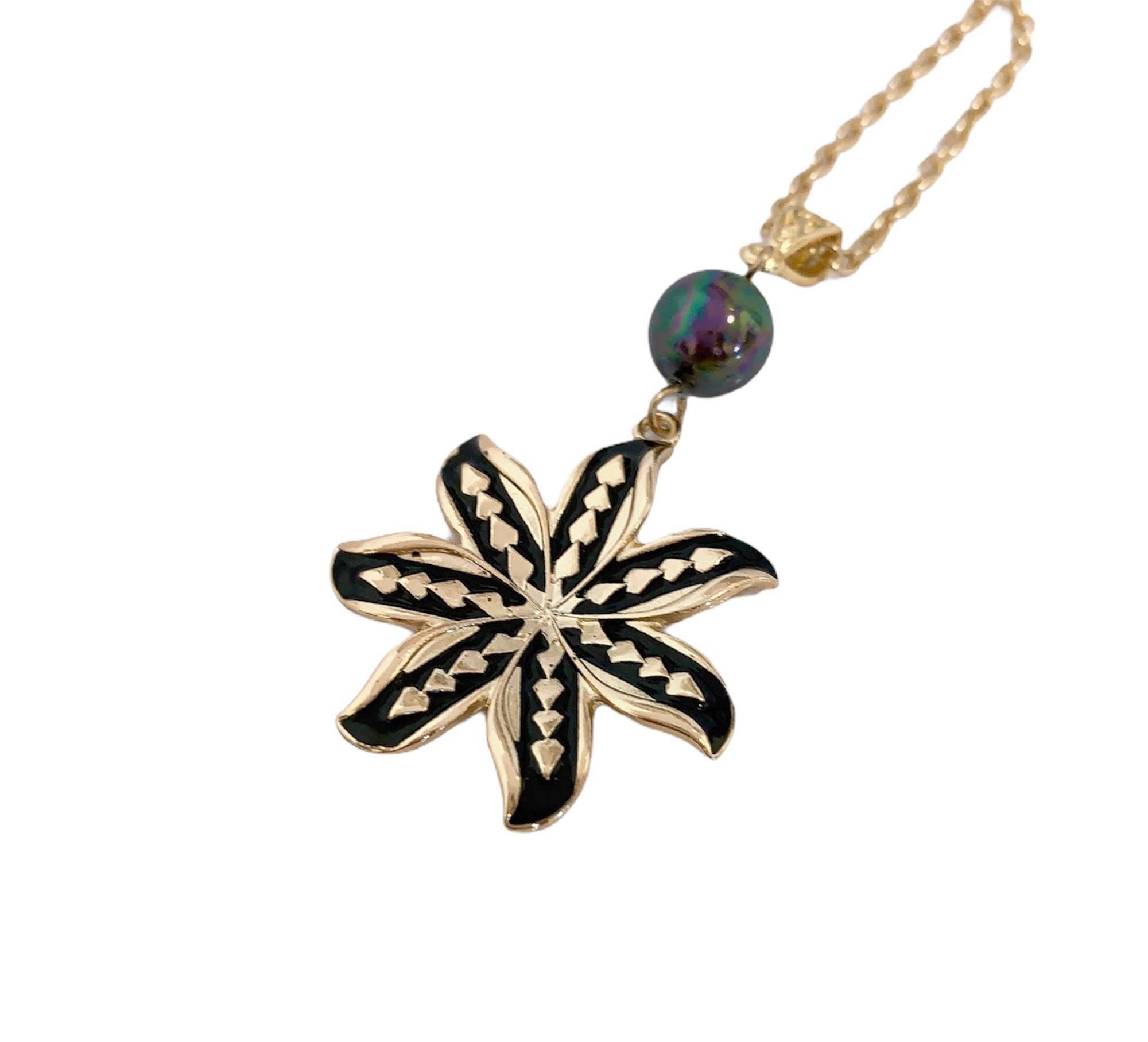 Hawaii black enamel fish hook with shell Hamilton gold