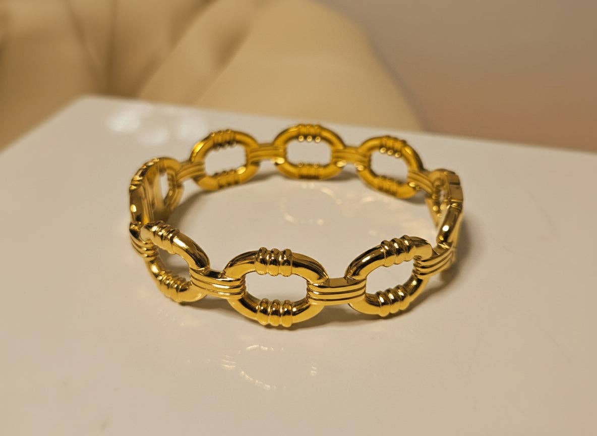 Lock design bracelet bangle. Available in silver, gold or silver & gold. Crafted from premium 316L stainless steel with triple-layer 18k gold plating and durable PVD coating. * Waterproof, perfume-proof & sweat-proof * Tarnish-resistant & hypoallergenic * Comes with a protective pouch * 58mm diameter