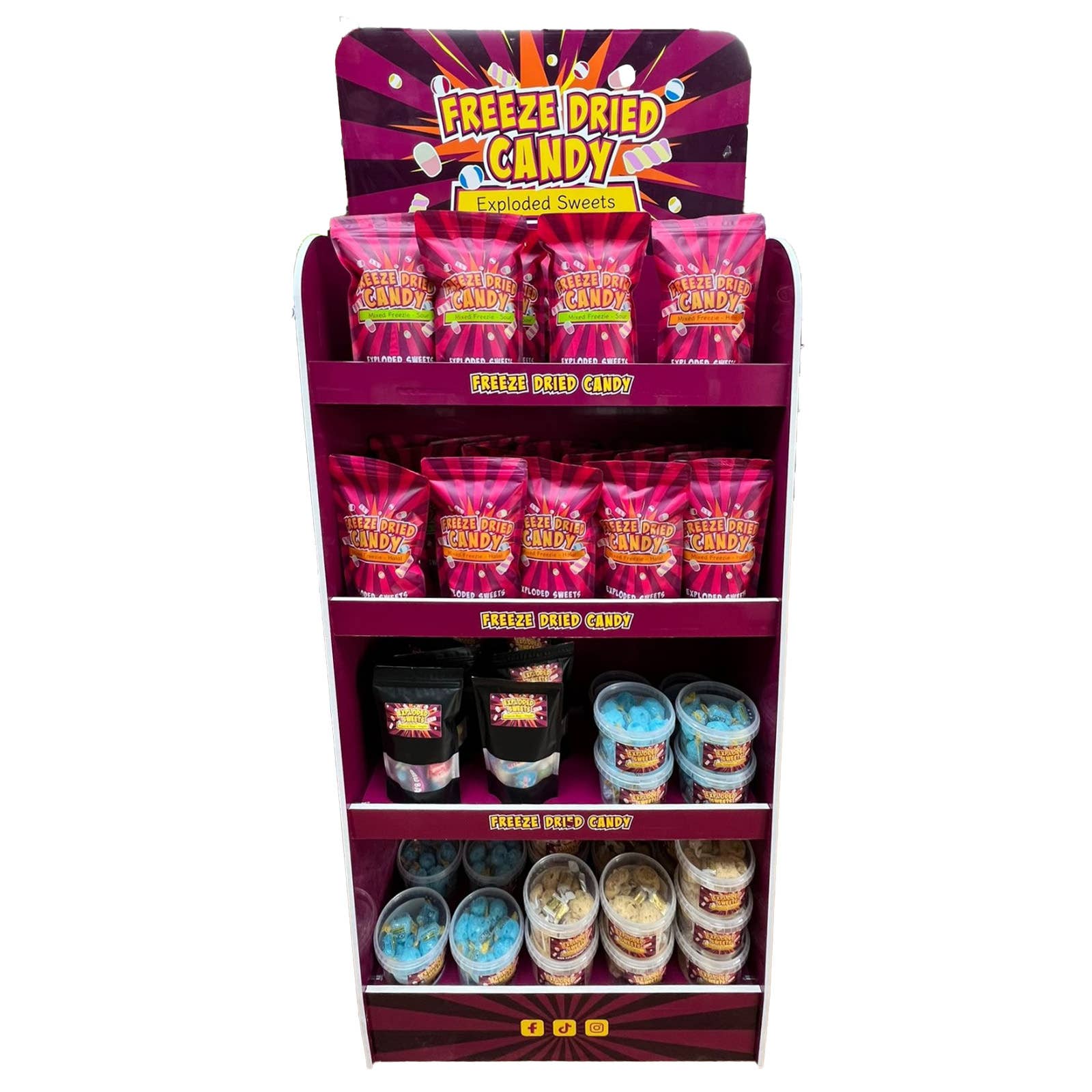 24 candy tubes with a free 1.85m display stand with 16 bins (the assortment may vary depending on arrivals, the list below is given as an indication) 2 tubes of 210 Maxi Tagada 1 tube of 210 Goldbears 2 tubes of 105 Happy Cherry 2 tubes of 210 Croco 2 tubes of 210 Happy Cola 1 tube of 210 Fried Egg 1 tube of 210 Smurfs 1 tube of 210 Smurfs Pik 2 tubes of 210 Crocopik 2 tubes of 300 Dragibus Soft 1 tube of 300 Fraizibus 1 tube of 150 Tropifun 1 tube of 150 Worms Pik 1 tube of 210 Flanbolo 2 tubes of 105 Langues Pik 2 tubes of 220 Mao Croqui fruits Price per candy