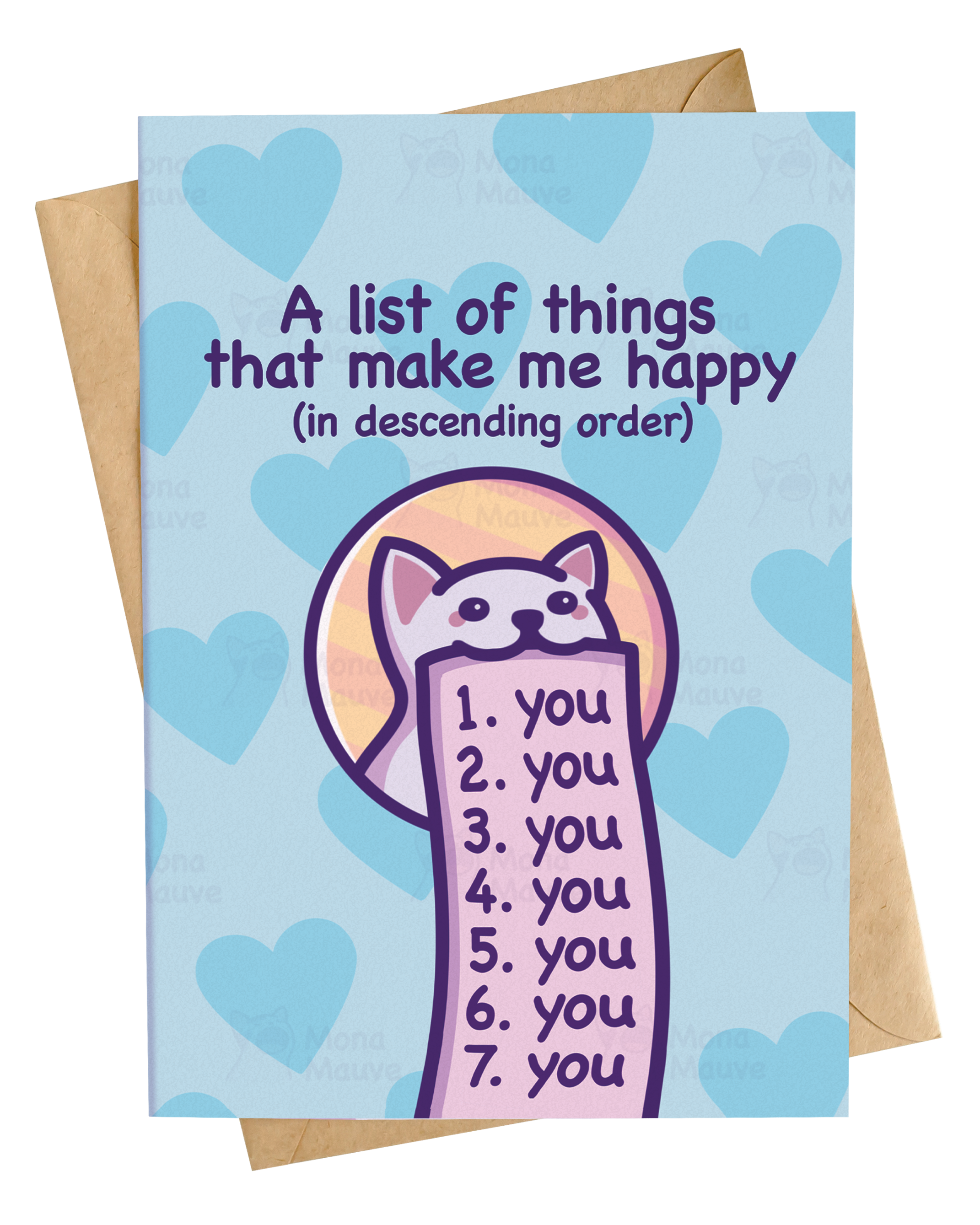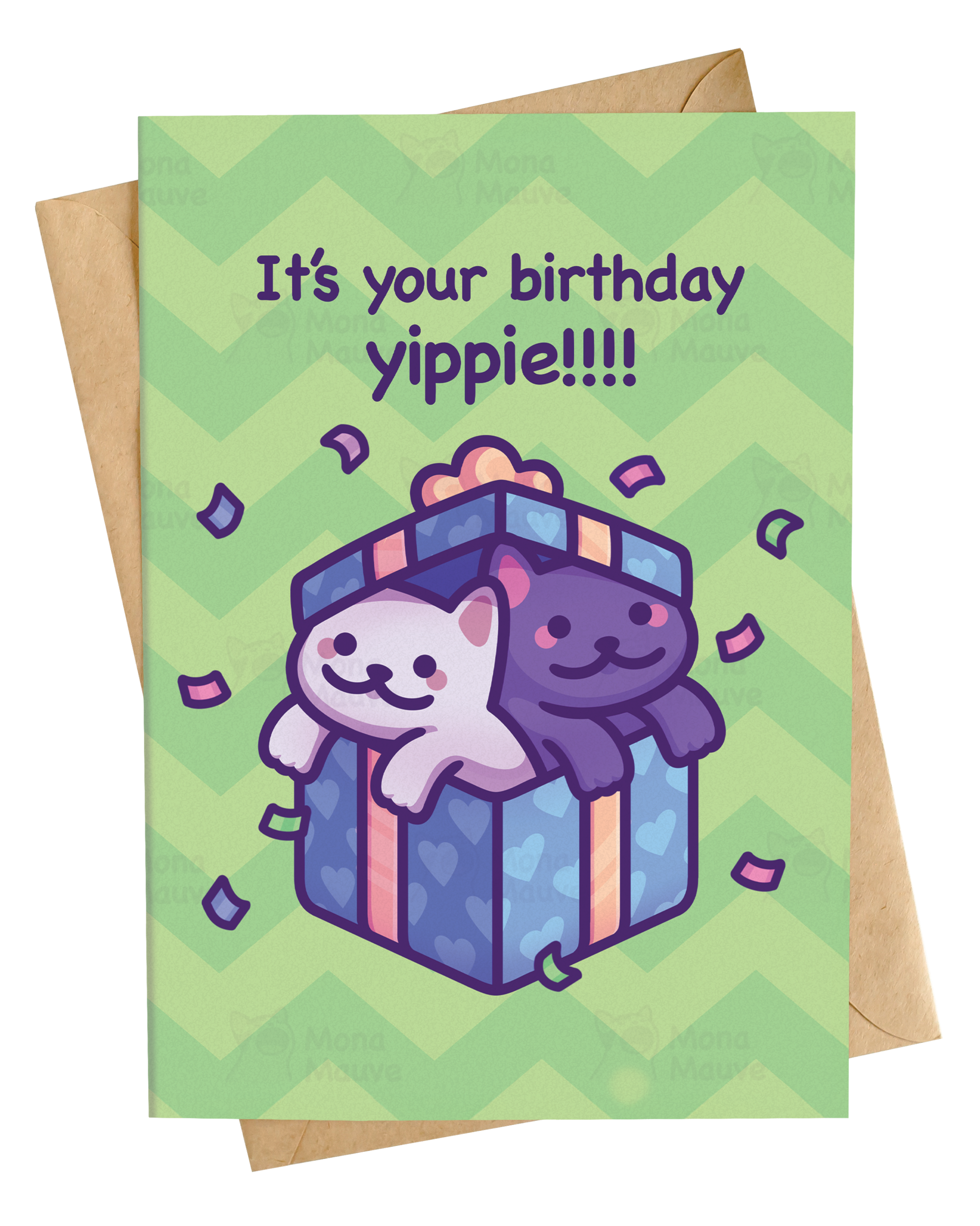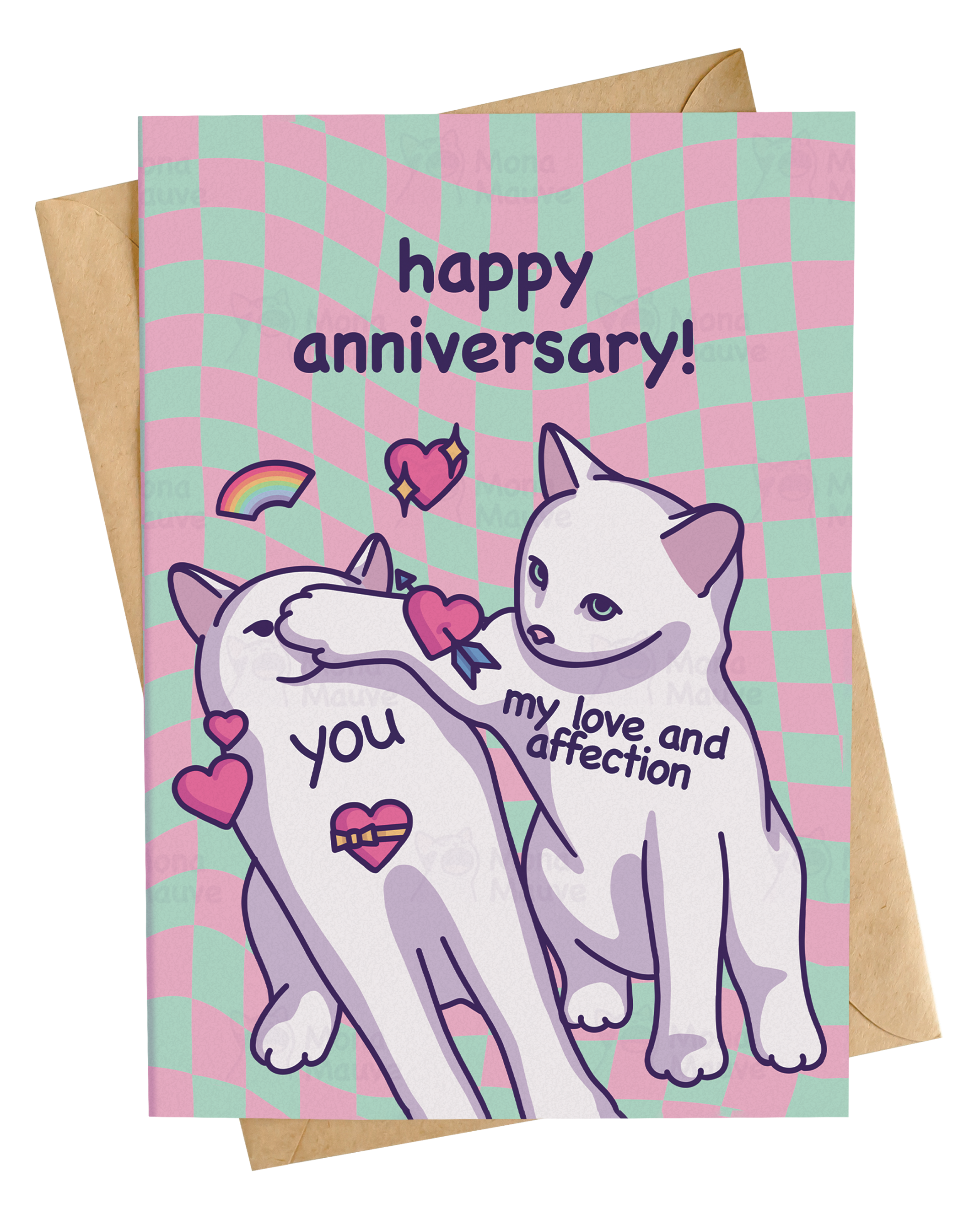 I'm in love with you and it's your fault - a funny & adorable card to express love to someone whose love language is cat memes! 💕 Perfect for anniversaries or just because! * Size: A6 (10.5 x 14.8 cm / 4.1 x 5.8 in) with a C6 envelope (11.4 x 16.2 cm / 4.5 x 6.4 in) * Designed by Mona Mauve * Includes a brown kraft envelope * Comes in a biodegradable display bag ready to be sold! * Blank inside * Printed on premium heavy matt cardstock (300 gsm) Copyright © Mona Mauve All Rights Reserved