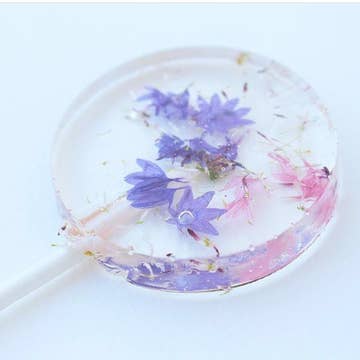 flower lollipop “La vie en rose” flowers: rose petals Taste: rose Handmade & sugar free Includes hang tag that invites customers to use lollipop as a (present) gift Best before date: 6 months ingredients: lollipops with 2% flowers, sweetener (isomalt), rose petals, water, ethanol, rose oil, coloring (gold) Average nutritional values per 100g: Calorific value 822 kj/197 kcal, carbohydrates 98g, contains small amounts of fat, saturated fat, protein and salt, may have a laxative effect if consumed excessively. Storage: at room temperature We recommend presenting all our flower lollipops in the Salon Buck cake stand. The cake stand has space for 46 lollipops and must be ordered separately.