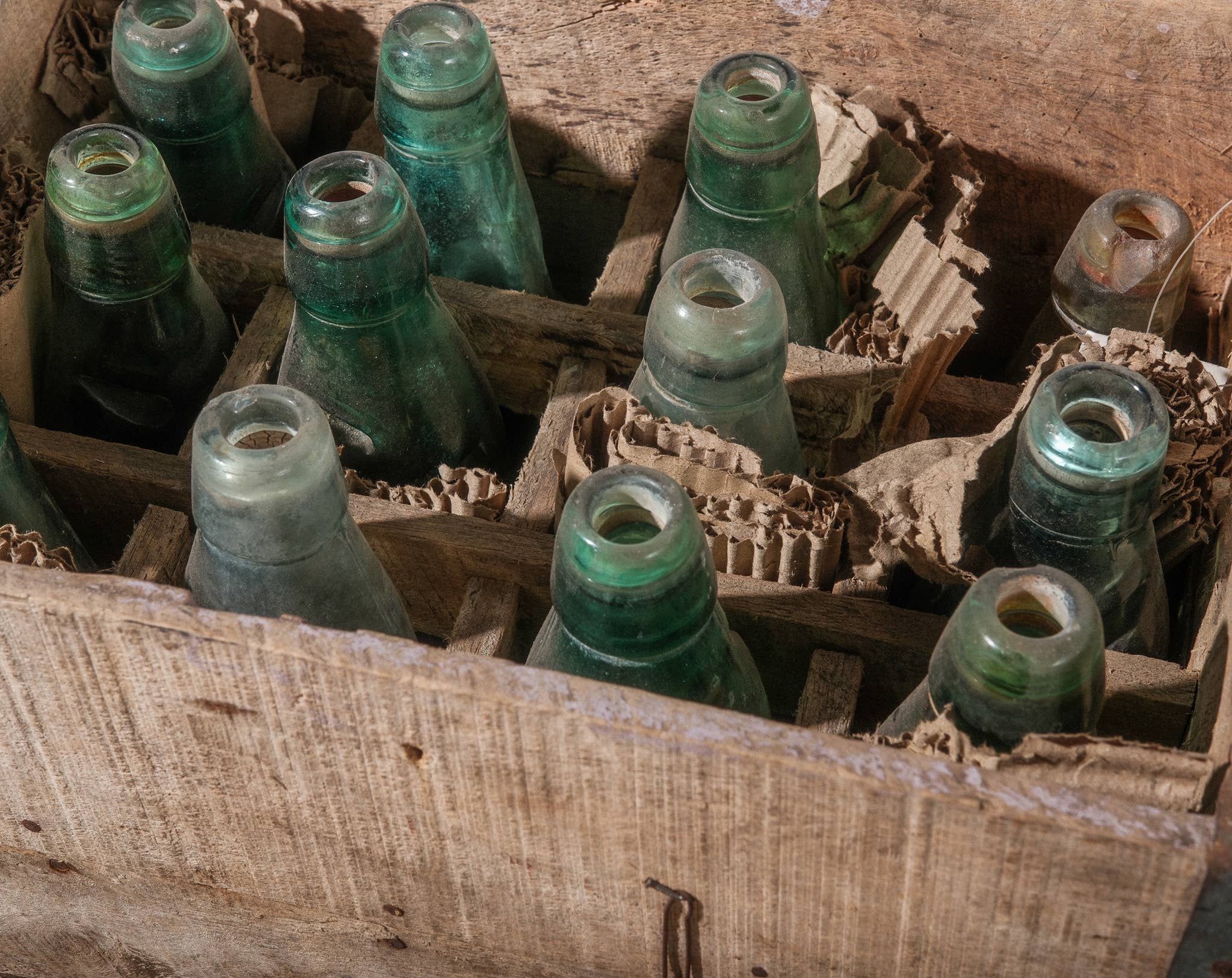 Codd Bottles were invented in 1872 by British engineer Hiram Codd specifically for carbonated drinks. Instead of a cap, the carbonation forced a glass marble against a rubber washer in the neck to seal the bottle. When you wanted to drink, you would push the marble down into a chamber in the bottles neck, where it would rattle around while you poured making a very distinctive sound and look. Collectors prized these bottles due to their quirky design and historical link to early soda. These bottles were primarily used in Europe and may still have an embossed name and/or location along the base. Each bottle is hand blown glass and due to its again (almost 80+ years old) there may be slight chips or flea bites in the glass. Each bottle measures 6-7" h x 3" diameter ***Please check out a separate listing for the set of 12 bottles in original wooden crate