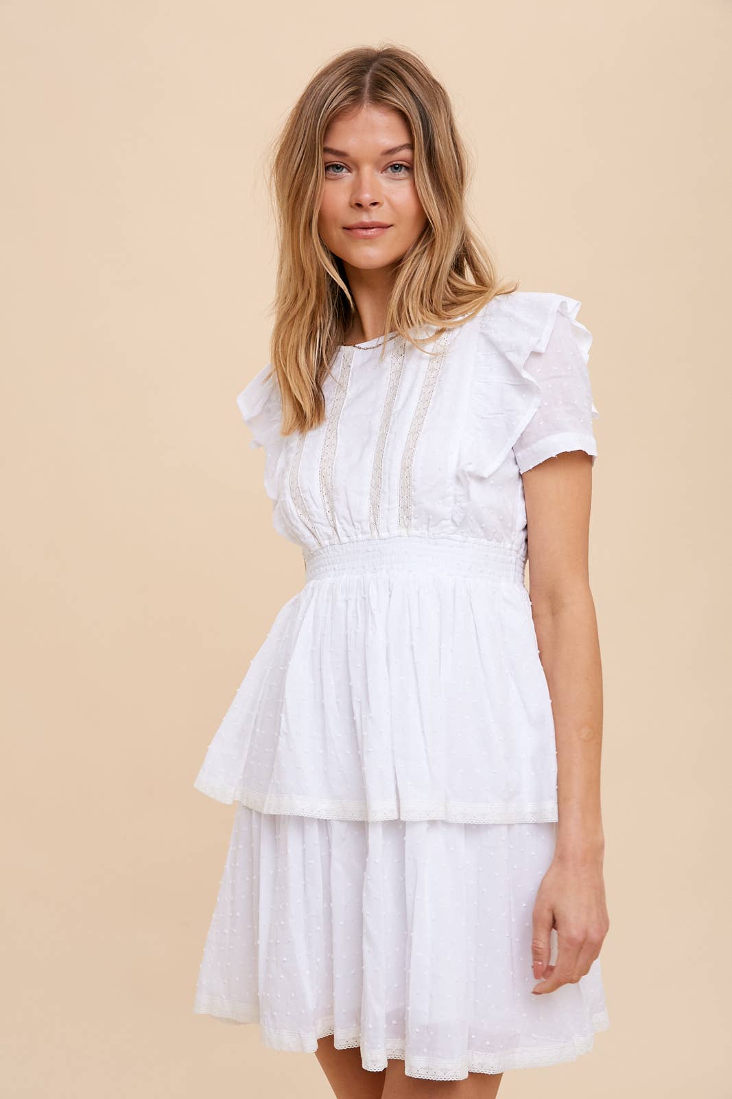 SWISS DOT LONG SLEEVE PEASANT DRESS FEATURES SMOCKED WAIST, FULL LINING, TIERED SKIRT, AND SELF TIE ON A SQUARE NECKLINE.