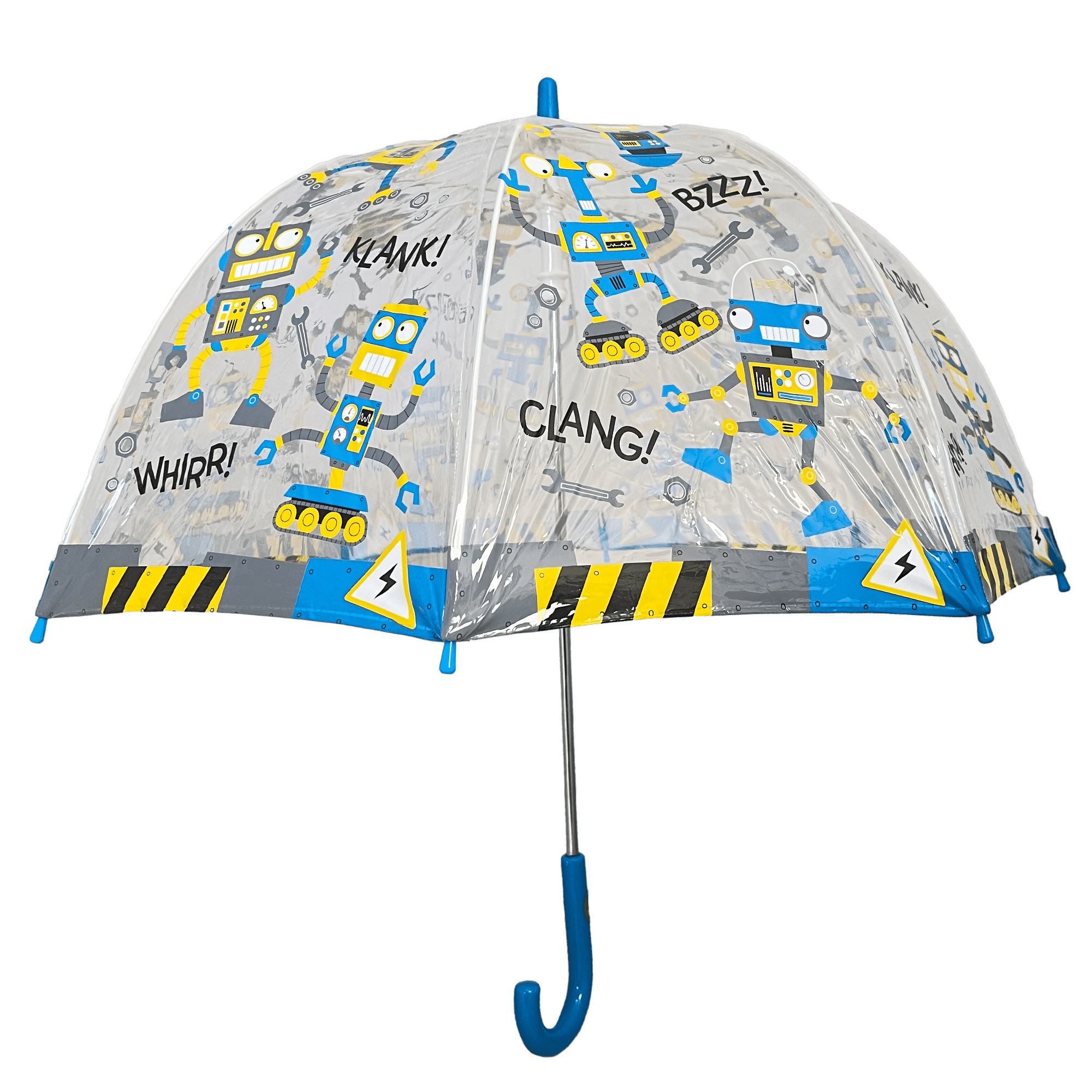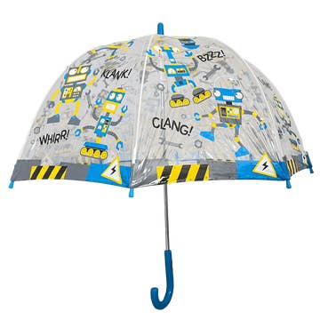 Kids will love these fun and funky outer space design see-through umbrellas, they won't want to go outside unless It's raining!! Perfect for age 5 and above, they have a black coated metal frame and a 19" auto open dome shape which gives complete coverage of the head and shoulders. Made from an ultra-durable transparent POE material, they are printed with bright colours in beautiful designs with contrasting brightly coloured plastic handles finishing off the look. Size: Length when closed - 660mm, Span when open - 690mm