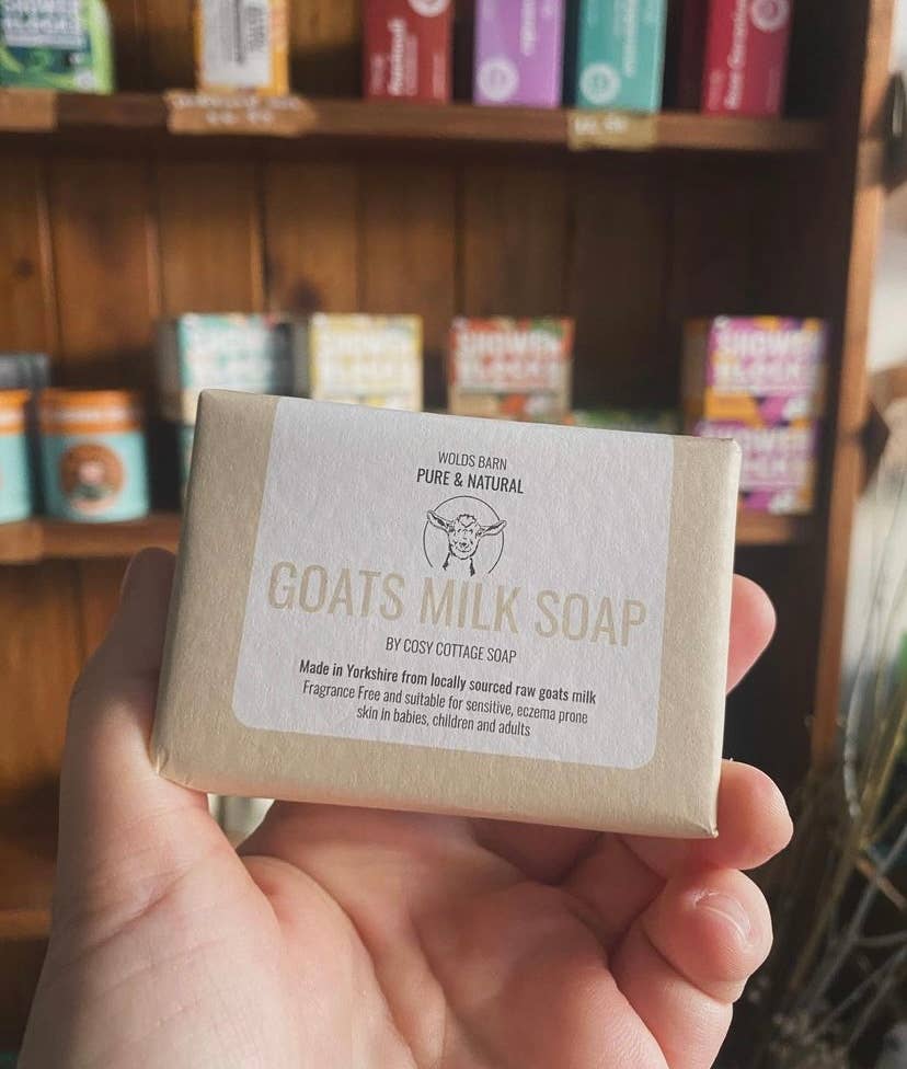 We have partnered with our friends just down the road in Duggleby, North Yorkshire, at Wolds Barn Produce. Their local, raw goats milk is some of the best we've found and we are delighted to be able to offer these luxurious and long-lasting 120g bars of goats milk soap to our customers. Goats milk soap is cited in many studies as being helpful for eczema and other skin conditions. Therefore, to widen the positive benefits we are able to offer our customers, we have created two versions: - a fragrance free version which is suitable for babies from 4 weeks and anyone older. This is ideal too for those with multiple allergies who would be troubled by the addition of any fragrance at all - a lightly lavender essential oil scented version which is suitable for anyone over the age of three years.