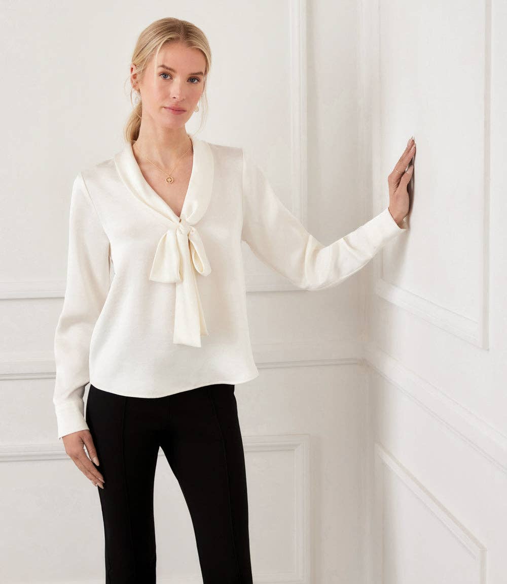Crafted in a luxurious Hydrangea Satin Floral Print, this blouse showcases a soft, lustrous finish with an elegant floral design. A collared neckline adds classic polish, while the long blouson sleeves with shell button cuffs bring a refined touch. The tie-front detail creates a flattering silhouette, making it versatile for both day and evening wear. * Designed for a relaxed, slightly draped fit. * Hydrangea Satin Print: 51% Viscose Ecovero 49% Viscose * Imported of Italian Fabric * Hand wash cold, lay flat to dry or dry clean. * Length: 21 1/2 inches (Size M) * Tie-knot closure * Unlined * Collared * Blouson sleeves * Button cuffed