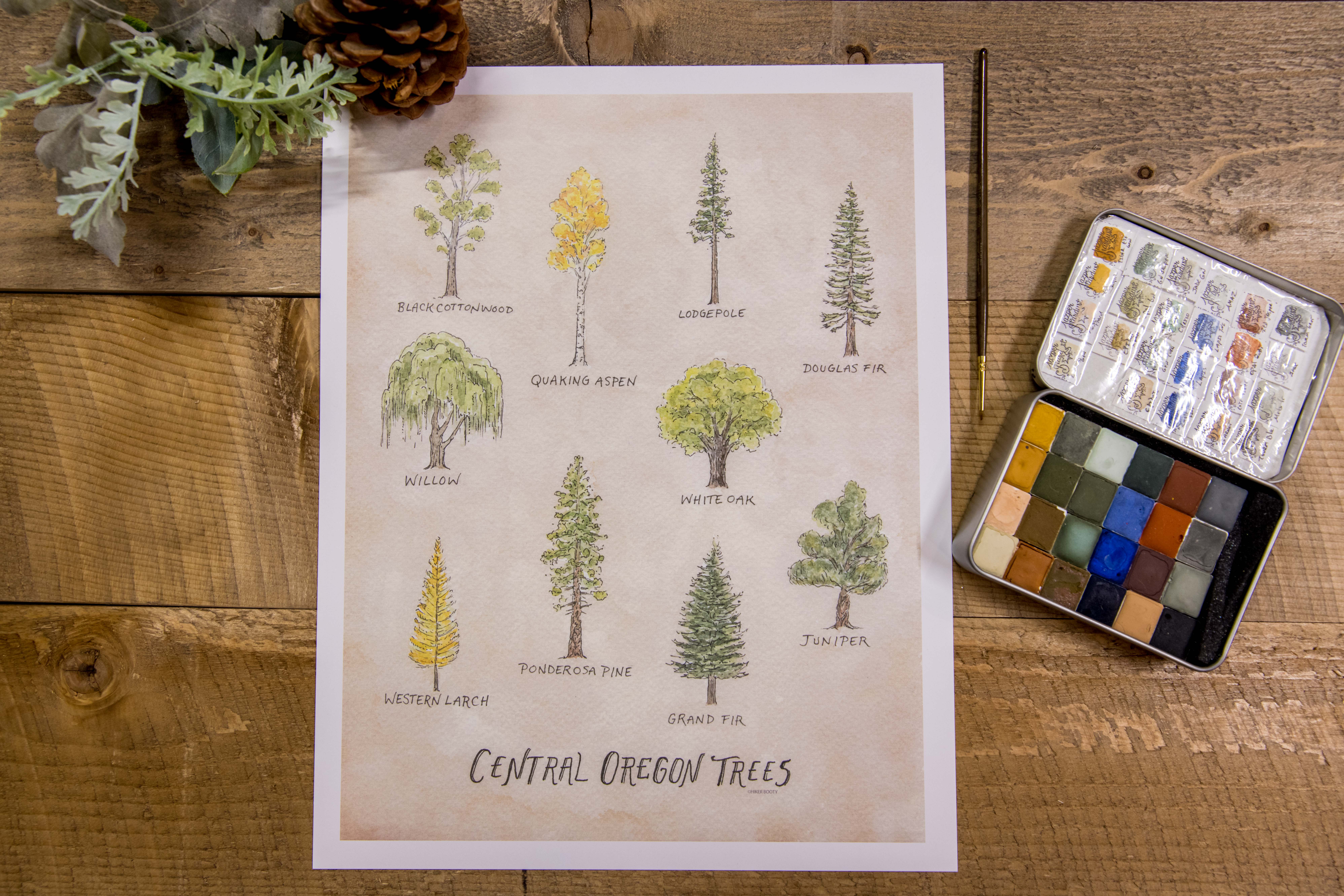 Central Oregon Wildflowers 8"x10" Art Print Watercolor Hand Drawn Oregon is home to countless species of flowers! Here, are 12 carefully selected native flowers to Central Oregon. 8" x 10" Art Print Orientation: Horizontal High quality print on premium card stock paper. Finest ink used to enhance rich textures and color. Packaged with cellophane, backing board and Hiker Booty business card Created with watercolor, pen and ink. Printed & shipped from Bend, Oregon