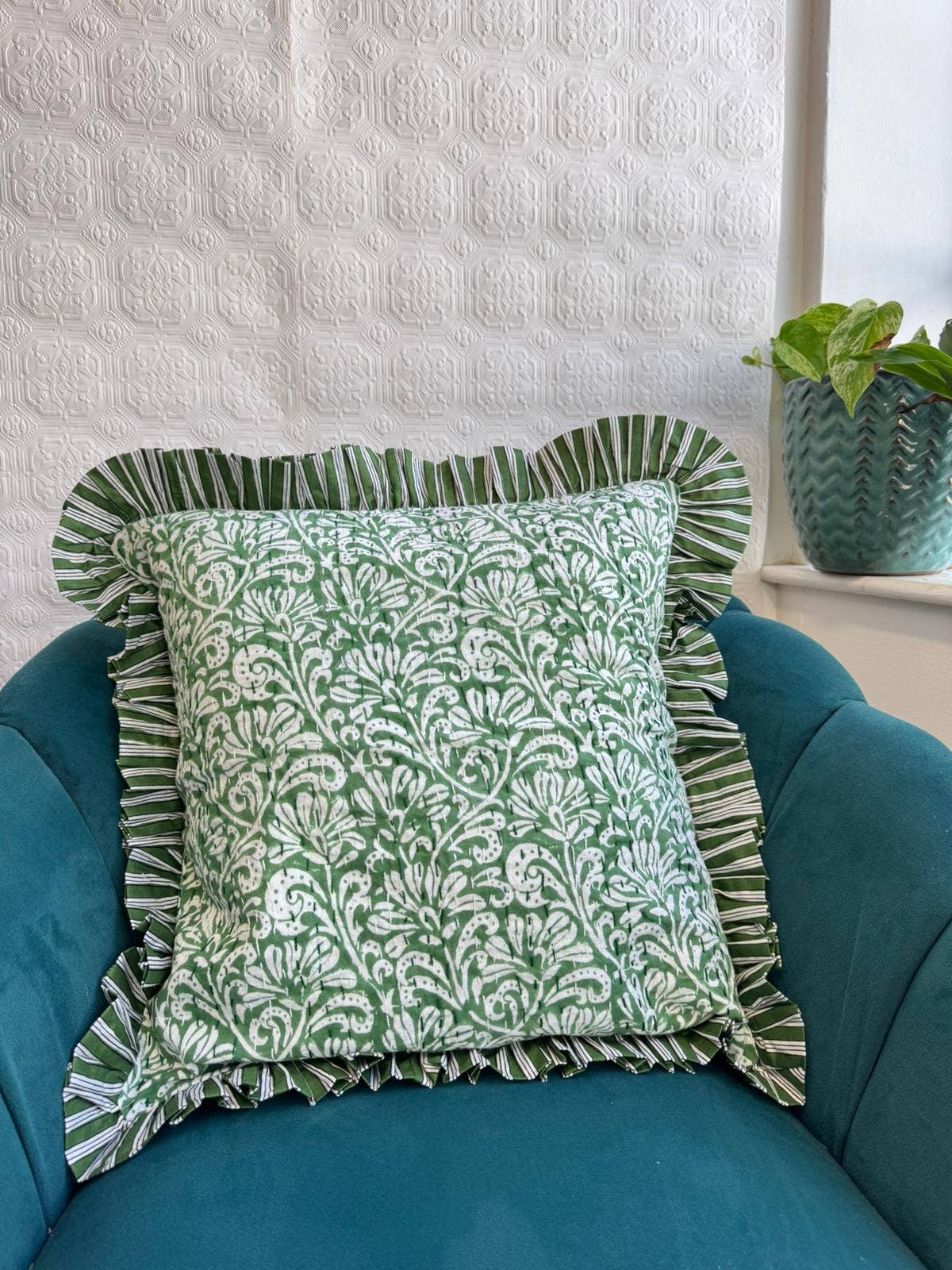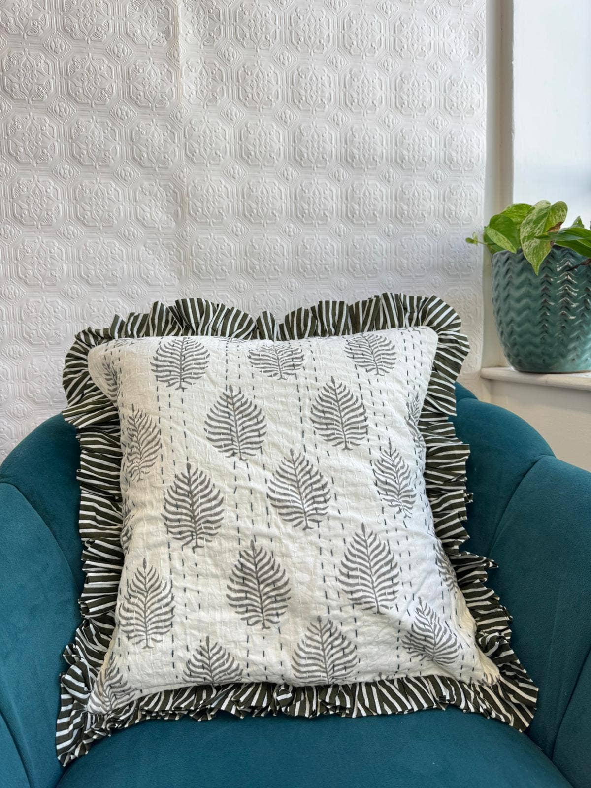 High Quality Handblock printed Kantha Throws in 100% Cotton. Classic French Stripe Statement Borders on all four sides . Cushion Cover- 18 inches X18 inches Kantha is a simple hand embroidery of a running stitch that combines pieces of cloth. In Traditional India & Bangladesh most women gather to spend time together and create art in forms of their work while also generating money for their families. We avidly support and encourage Women Employment and Fair-trade . By choosing Kantha products you contribute to choosing something Eco- friendly and Sustainable made from locally grown 100% Cotton. We try our best from our end to ensure correct colours during photography but colour may slightly vary depending upon screen resolution. We click in Natural light and sometimes outdoor shots are included to show colours . Pls choose shipping upgrades according to your needs. For any doubts feel free to message us .