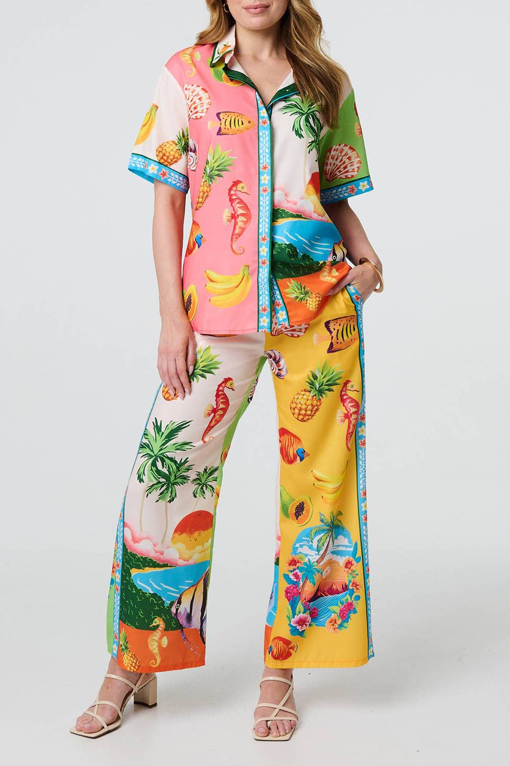 Printed Shirt & Shorts Co-Ord Set with a short sleeved shirt and matching high waist shorts. Short sleeve shirt Collar Buttons High waist shorts Pockets Relaxed fit Thigh length Ric rac contrast trim Product Code: SET733430 Model is 5'10/178 cm and wears UK10/EU38/US6/AUS10