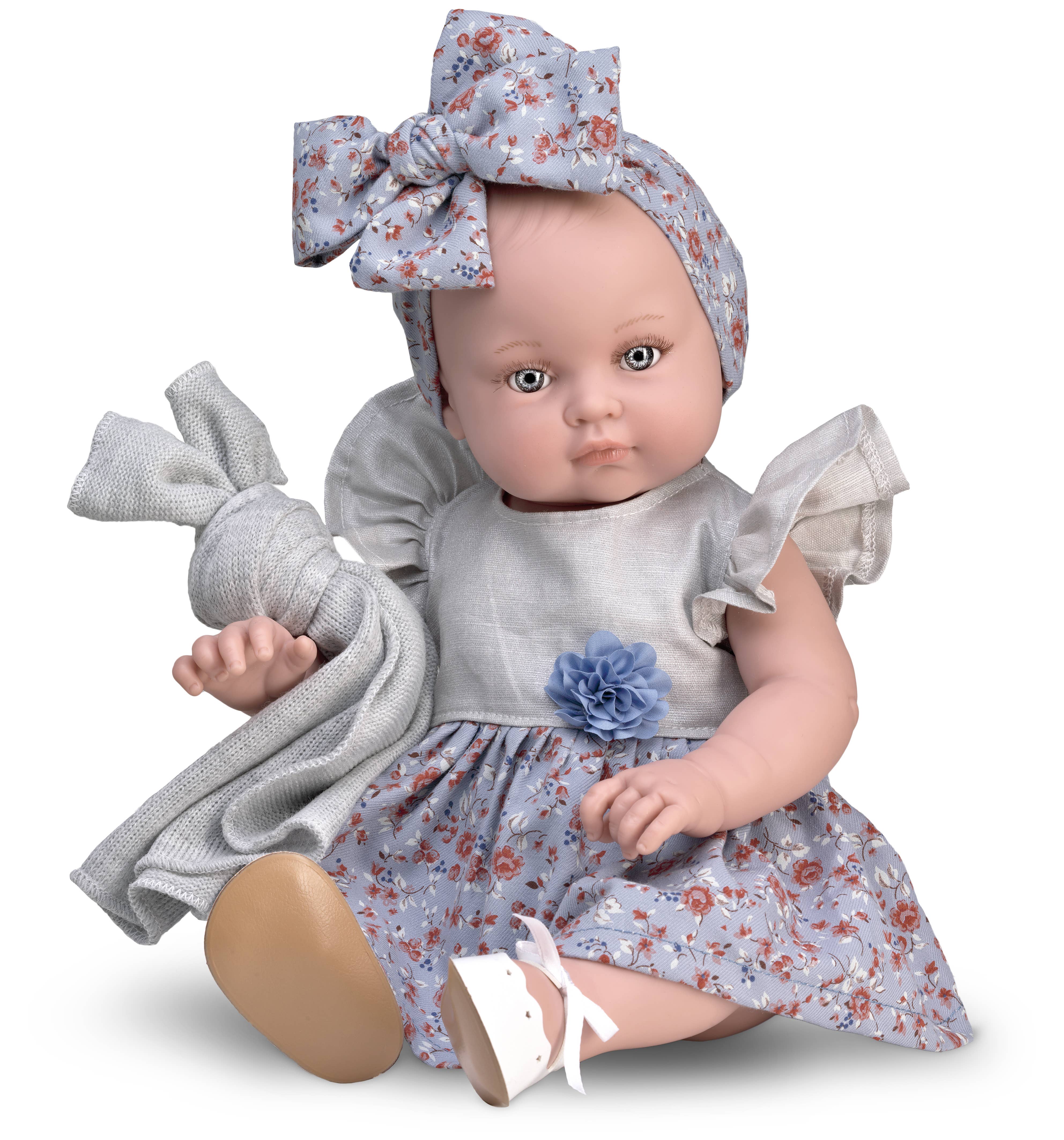 47cm girl without hair. Articulated head, arms, and legs. Doll made of vinyl with a hard body, vanilla scent in Spain. Her eyes are gray. Anatomically correct doll. Presented in a fun box that simulates a doll workshop. Eco-friendly box made from recycled material.