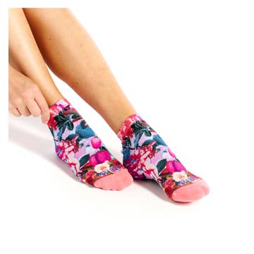 The ultrashort Bamboo Angles Loom socks from Dub & Drino feature pink tones and refined patterns combining strawberries, roses, and cherubs for a romantic and elegant touch. • Size: One size • Composition: 78% bamboo viscose, 20% polyamide, 2% elastane • Pattern: Strawberries, roses, and cherubs • Soft touch, odorless, bamboo viscose is light and breathable, cooling and wicking away moisture. • Easy care: hand wash or machine wash at 30°C. Wash inside out.
