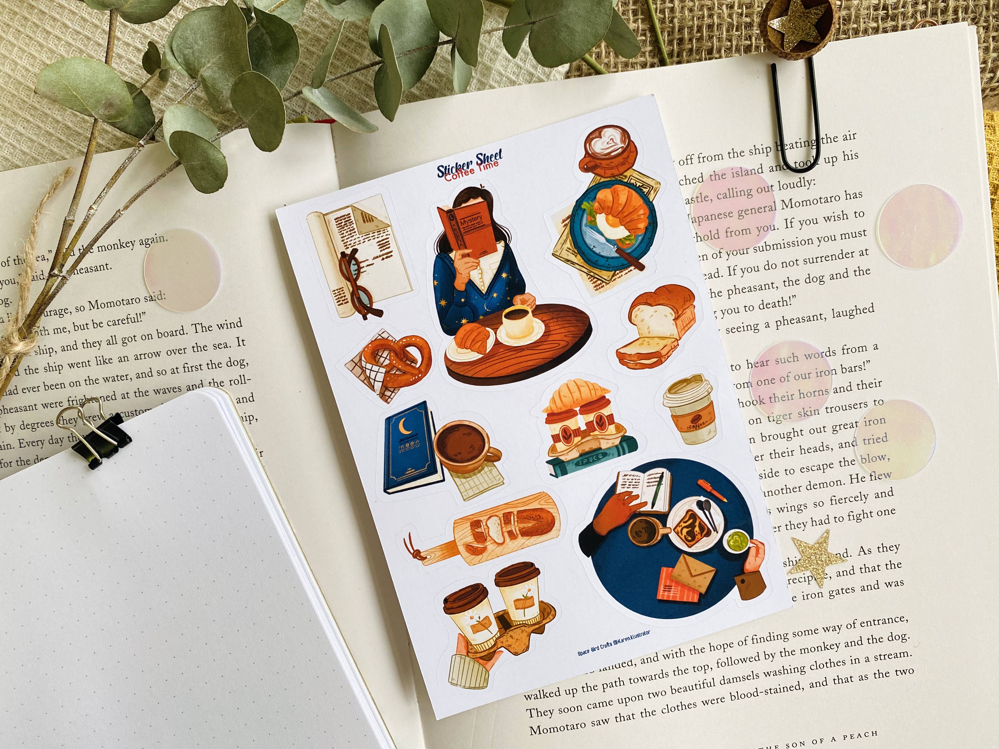 Decorative stickers to decorate your Bullet Journals, Planners, and Scrapbooks. The sheet contains 14 stickers in total. ---------------------------------------------- S I Z E S & M A T E R I A L S Sheet Size: 168 x 118 mm (6.6 x 4.8 inch) All of my stickers are printed on matte white sticker paper and kiss cut with the Cricut Explore Air 2 machine. --------------------------------------------- N O T E S All our products are entirely handmade - from illustrating to producing and shipping. **The colors may vary depending on your screen settings.** **Our stickers are not waterproof!** Send a message if you have any questions. We love to help. Im ausgewiesenen Rechnungsbetrag ist gemäß § 19 UStG keine Umsatzsteuer enthalten. © Space Bird Crafts. All rights reserved. Aka Karen Tuba