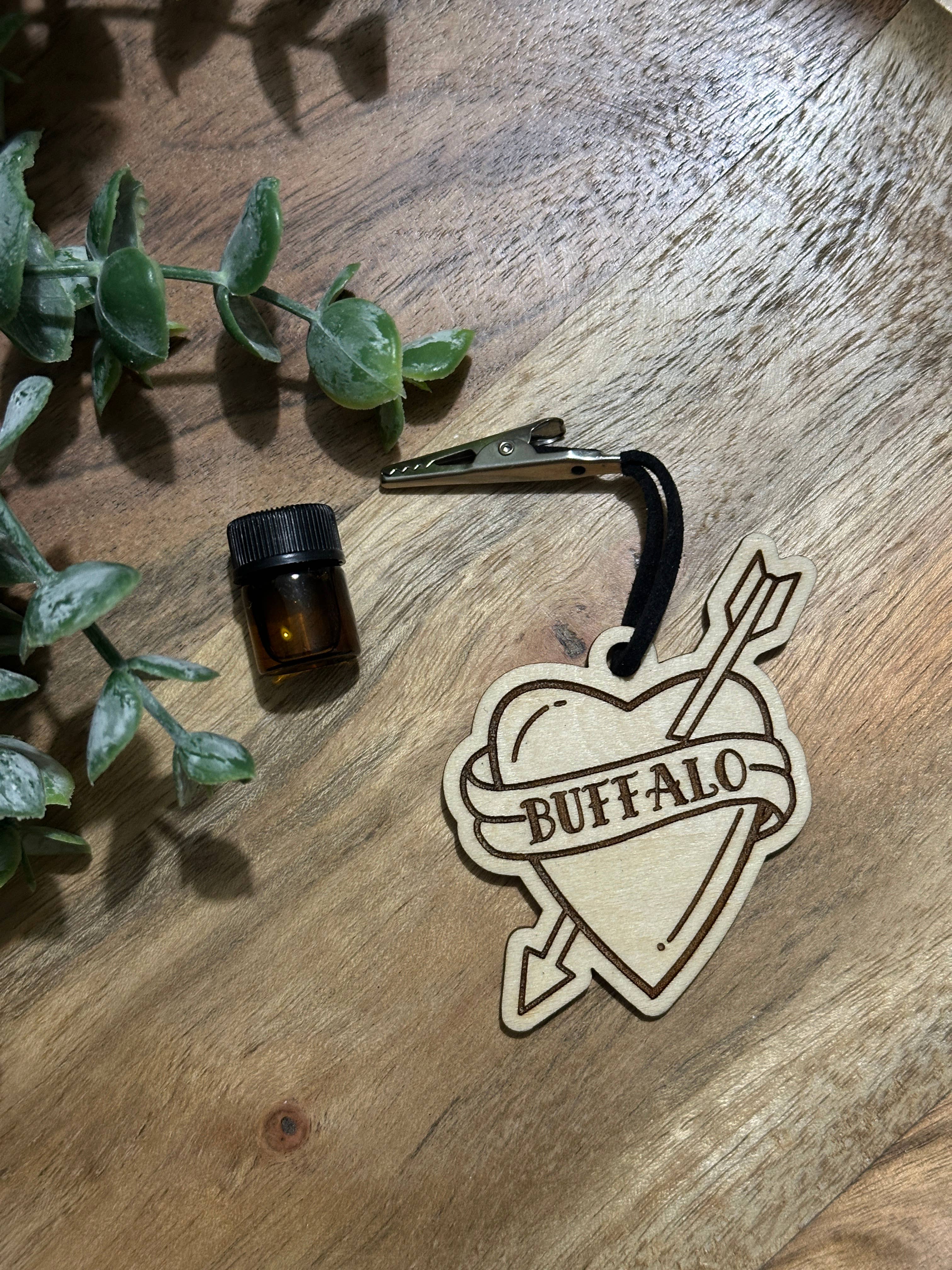 Wooden diffusers are a clean alternative to traditional car air fresheners. You can use it with any scent you like, oils last longer than alcohol-based scents. You can use this diffuser on indoor fans, car vents, or any space you're looking to freshen. Approximate dimensions: 3x1.6” This diffuser is laser engraved and cut for indoor use. Each diffuser has a suede or leather cord and metal clip to hang from your car air vent. Each one is unique, which may cause the design darkness/lightness to slightly vary. To rescent, drop your desired amount of essential/fragrance oils on the back. Each diffuser comes with a mini bottle of lemon eucalyptus oil. **clip is metal and may scratch or mar surface of vent- we are not responsible for any scratches, marks or damage**