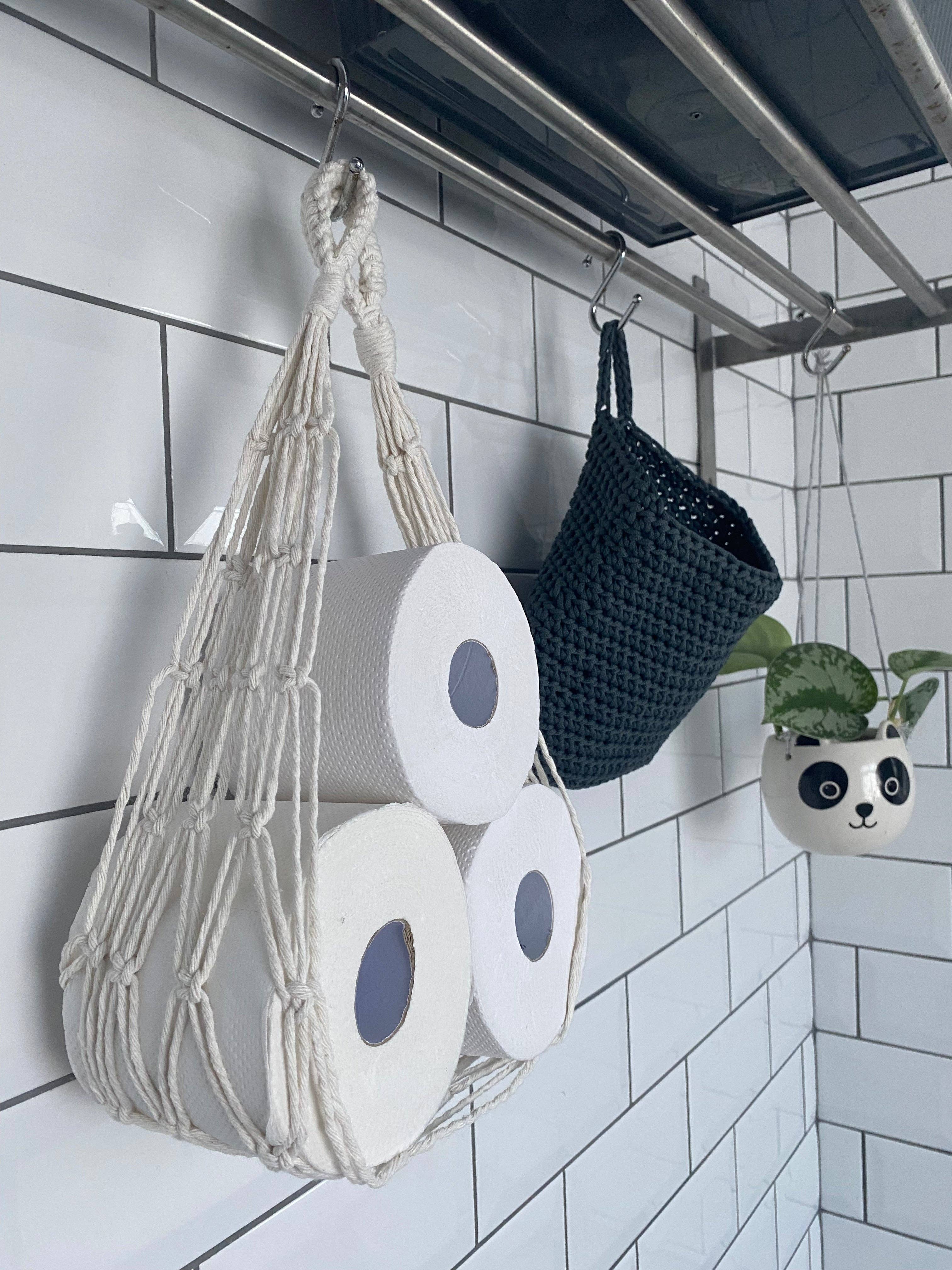 This hanging toilet paper holder is a softer, more sustainable alternative to the usual plastic or metal ones you tend to see in bathrooms. It’s designed to hold a single roll in use, and it adds a lovely bit of texture to your space at the same time. You can choose between a wooden ring or a knotted loop at the top, depending on the look you prefer — both are easy to hang from a wall hook, peg rail or over a cupboard knob. No tools needed, no fittings to faff with. Each one is handmade to order using recycled cotton cord, and they’re a great little detail if you’re going for a more natural, boho, or minimalist feel in your bathroom. If you’re short on space, don’t want to drill into tiles, or just want something a bit different, this could be the one. Product Info * Handmade using recycled cotton * Fits one standard size toilet roll * Choose from wooden ring or knotted loop * Approx. width 20cm * Designed to be hung from a hook or peg If you’re looking for something to hold spare toilet rolls, have a look at my macrame toilet roll storage hammock too – it’s a great match. Warnings Not a toy - keep away from children. Do not wear or wrap around the neck - strangulation risk. Avoid overloading - excess weight may cause breakage. Keep away from fire and extreme heat. Clean with a damp cloth only, do not allow wooden parts to become wet. Air dry.