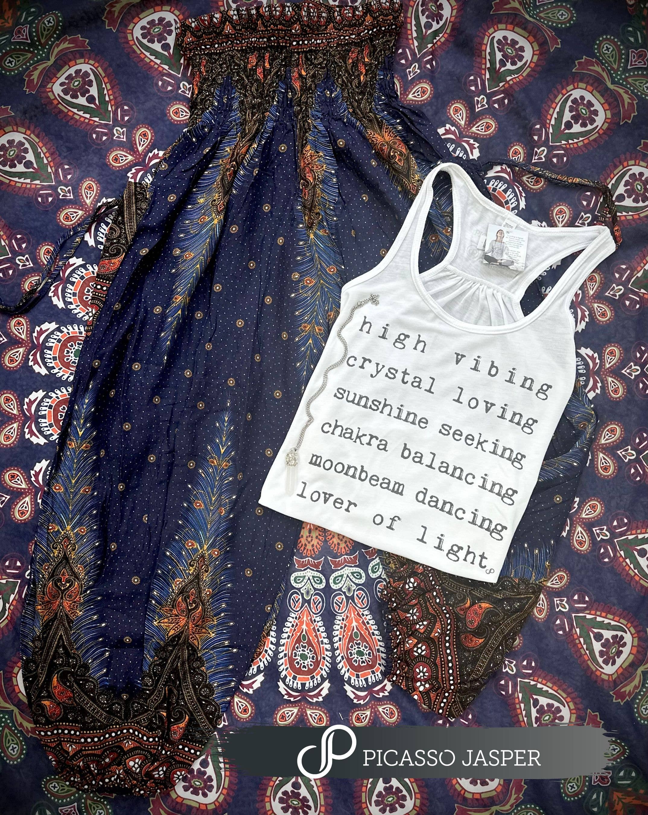 Shiva- named after the powerful Hindu deity embodying both destruction & transformation, often revered as the divine force that clears the old to make way for rebirth & spiritual awakening. These are really pretty & pair well with so many of our tees/tanks. I've paired it here with a few of our tanks! (tee/tanks sold separately). These two pocket pants are so comfy & wear/pack so well! Promise- you'll love them! FYI- We create these in small batches- by hand. The quality & fit is amazing. Some prints are very limited & may not be restocked. Snag them while you can! Pants are truly One Size Fits Most! These look great on XS-XL (some XXL like the fit too) 100% Rayon, quick drying! Best to wash on gentle or in a laundry bag- due to strings & delicate fabric. Please note: Tank & accessories are not included. This is to show you how we merchandise these. Tanks & accessories can be purchased separately!