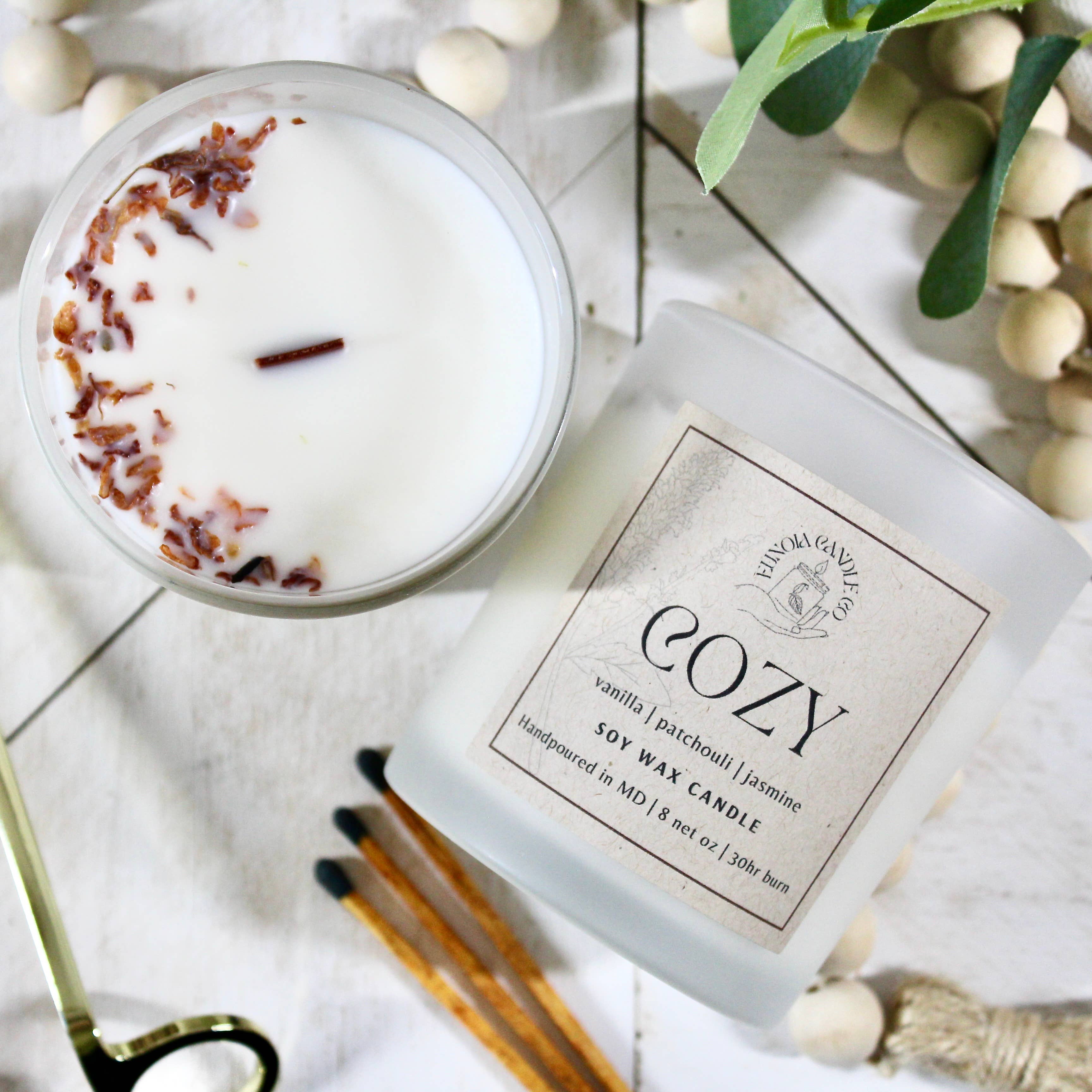 Made in United States Benefit: Mood Enhancing Burn Time: 40 hours Color: Clear and White Flame Type: Crackling Ingredients: 100% soy wax, Phthalate-free (non-toxic) fragrance oils, Forest Stewardship Certified crackling wood wicks Material: Glass Occasion Theme: Baby Shower, Everyday, and Wedding Occasion: Graduation and Wedding & Engagement Scent: Citrus, Earthy & Woody, Floral, Fruity, Minty, and Warm & Spicy Season: Year-Round Size: 8 oz Style: Bohemian Wax Type: Soy Wick Material: Wood Fragrance Notes: Bergamot, Cedarwood, Chamomile, Cinnamon, Coconut, Eucalyptus, Gardenia, Jasmine, Lavender, Leather, Lemon, Lemongrass, Lime, Musk, Orange, Patchouli, Peppermint, Rose, Sage, Sandalwood, Tobacco, and Vanilla Product Language: English Weight: 0.54 kg (1.2 lb) Dimensions: 7.4 x 9.7 cm (2.9 x 3.8 in) Product Materials: Organic, Plastic-free, and Vegan Packaging: Plastic-free and Recyclable