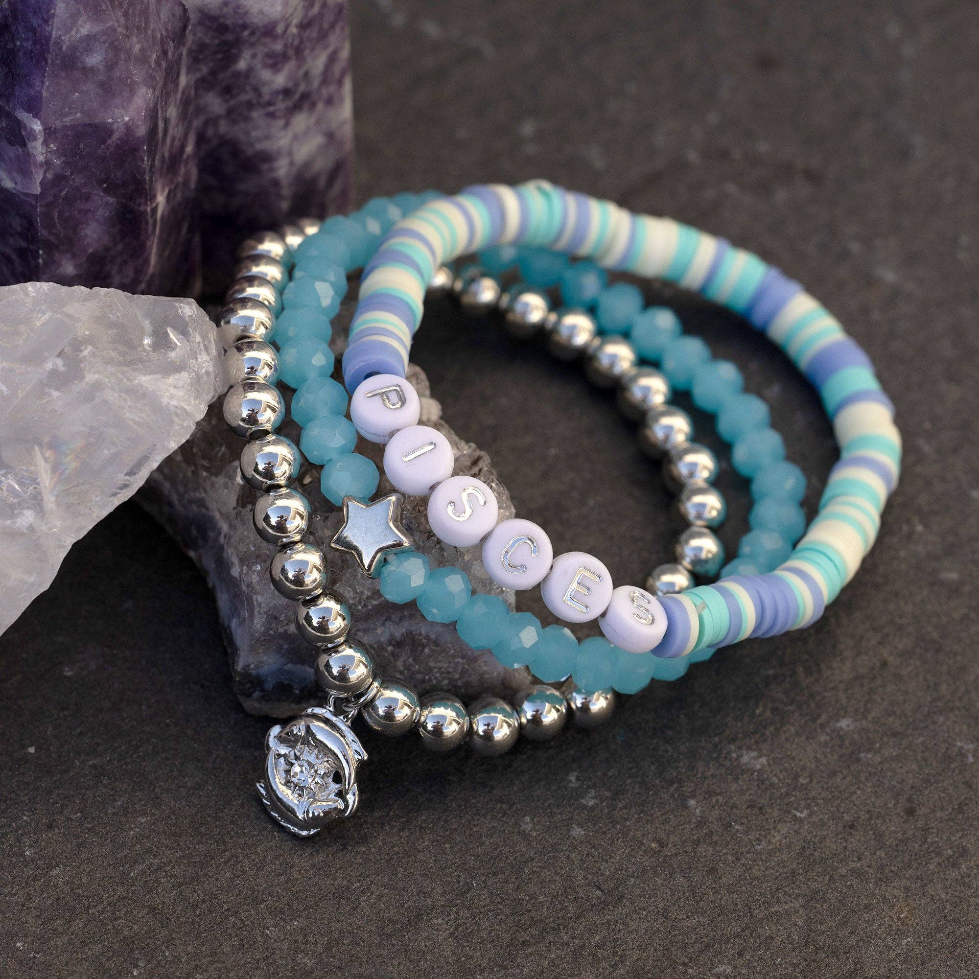 The Aquarius Zodiac Beaded Bracelets are celestial companions crafted to resonate with your inner essence. Specifically tailored for those born under the Aquarius sign, spanning birthdays from January 20th to February 18th, or for those cherishing a beloved Aquarius, these bracelets transcend mere accessories – they're cosmic insignias designed to grace your wrist with style and significance. Featuring a harmonious blend of purple polymer clay heishi beads complemented by acrylic metallic silver foil letter beads spelling AQUARIUS, this set is an ideal gift for January and February birthdays. Included are sparkling amethyst glass beads with a silver metal star, and a silver metal beaded bracelet adorned with an Aquarius water-bearer charm accented with a sparkling rhinestone. * Hand-crafted, polymer clay, glass, metal and acrylic beaded bracelet * 7" stretch bracelet set of 3 * Do not wet or expose to perfume